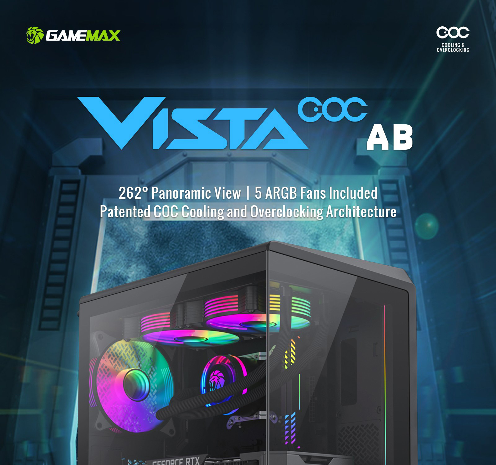 The Vista COC AB ATX Mid-Tower Gaming Case features a 262° panoramic view, patented COC cooling, 5 ARGB fans, and a sleek design with a modular layout for flexible builds.