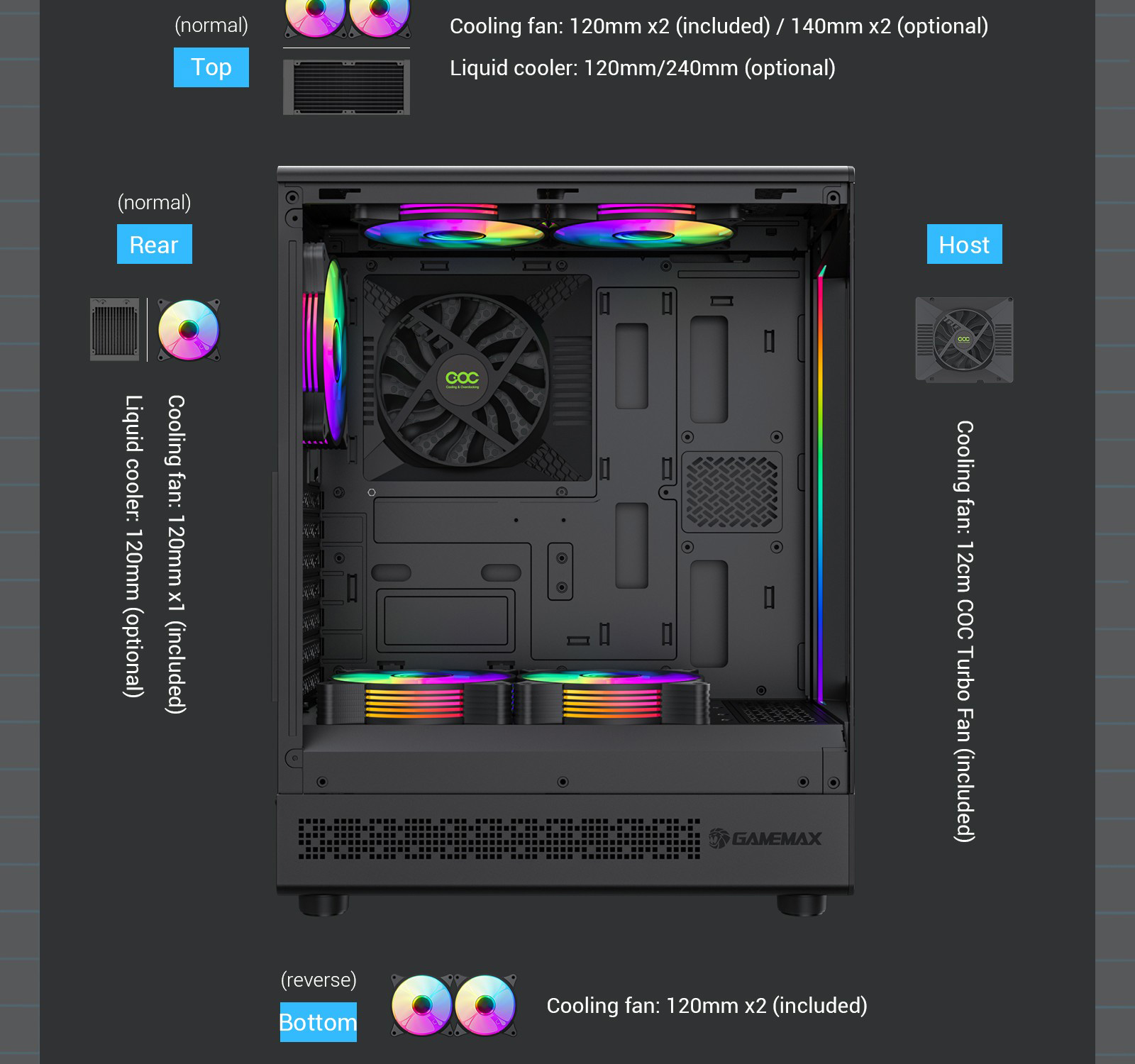 | Top | 2x120mm (included),2x140mm (Fan Optional) | |