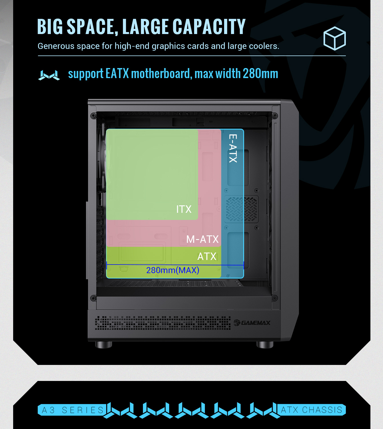 • Versatile Compatibility: Supports EATX, ATX, M-ATX, and ITX form factors.