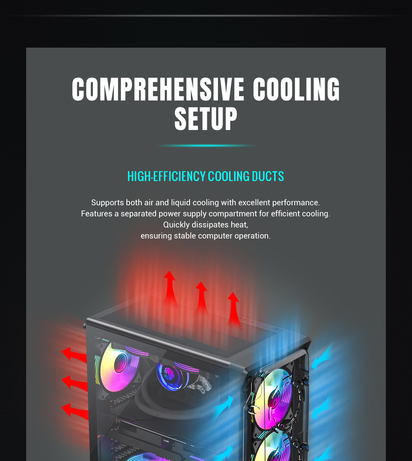 • Excellent Cooling: Supports up to 3x 120mm front fans, 2x 120mm/140mm top fans, and water cooling options (120mm, 240mm, 360mm radiators).