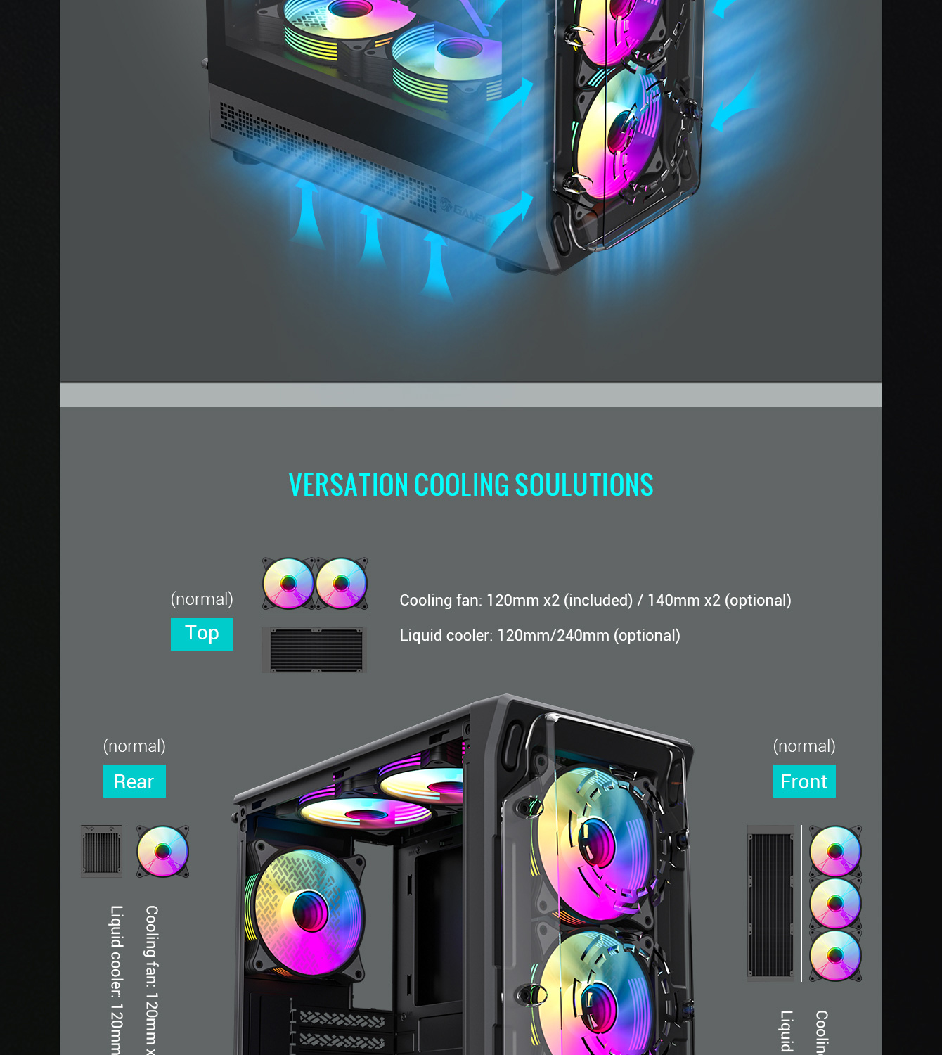 | Water Cooling Support (Radiator Size) | Front | 120mm, 240mm,360mm |