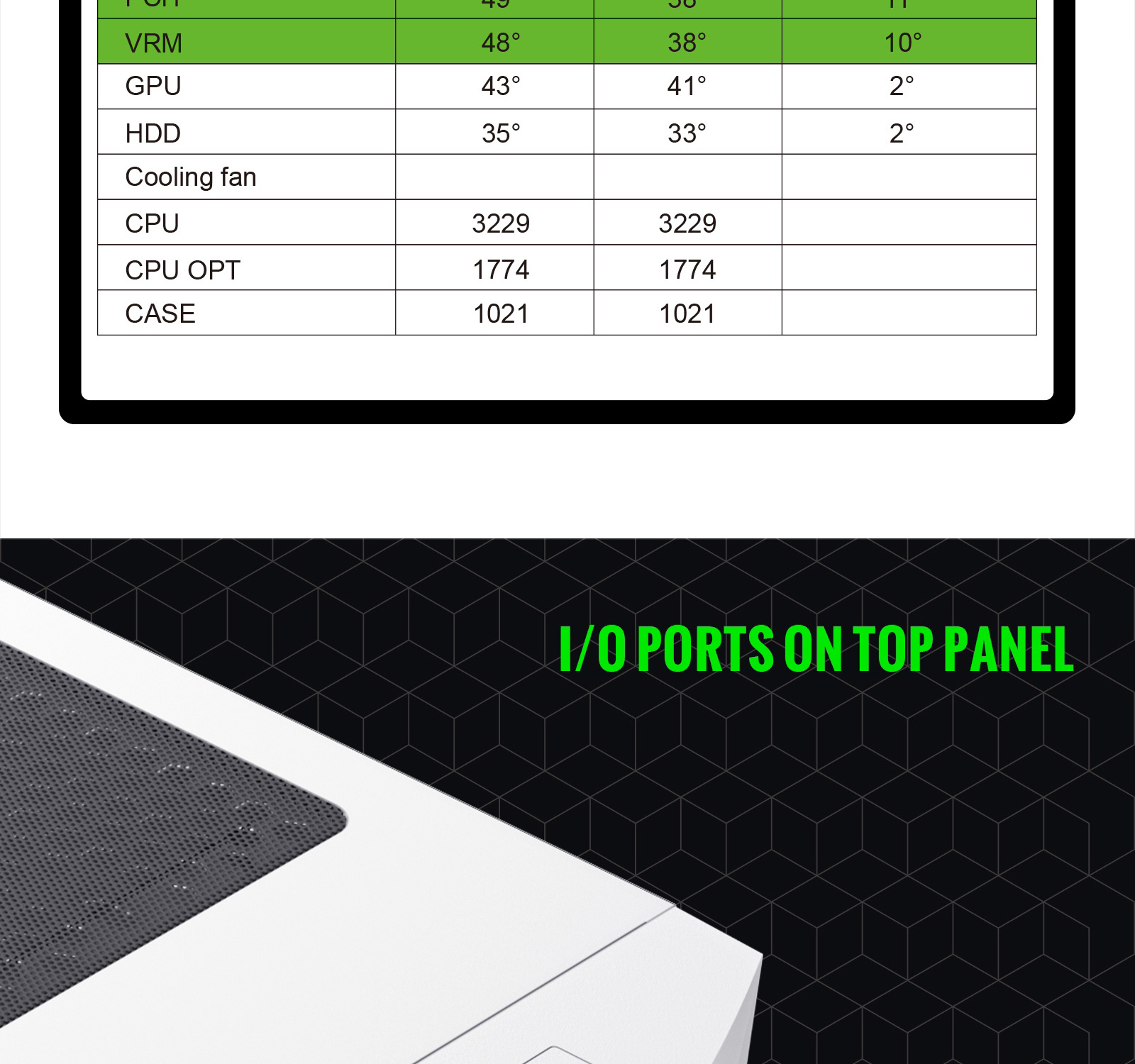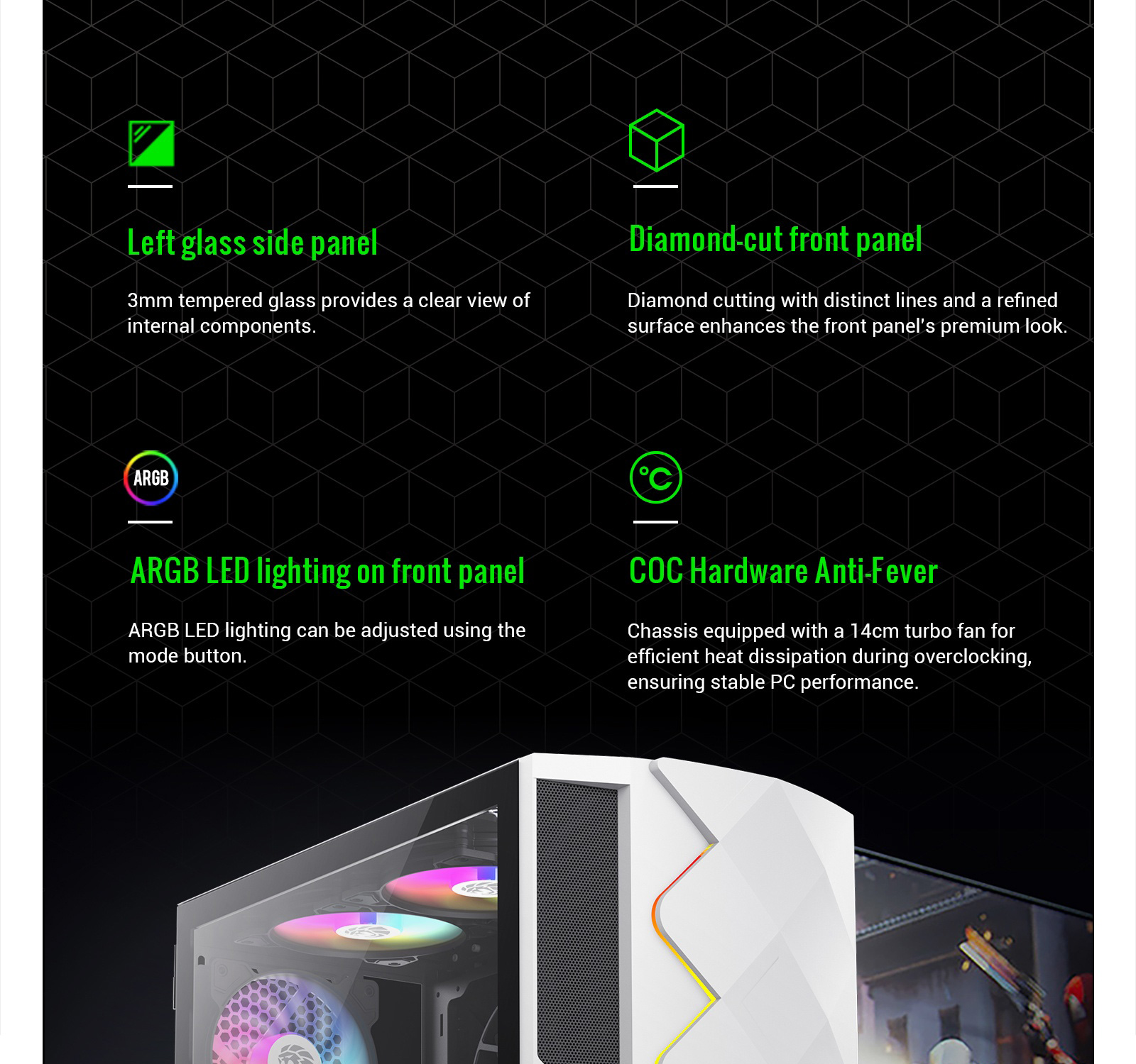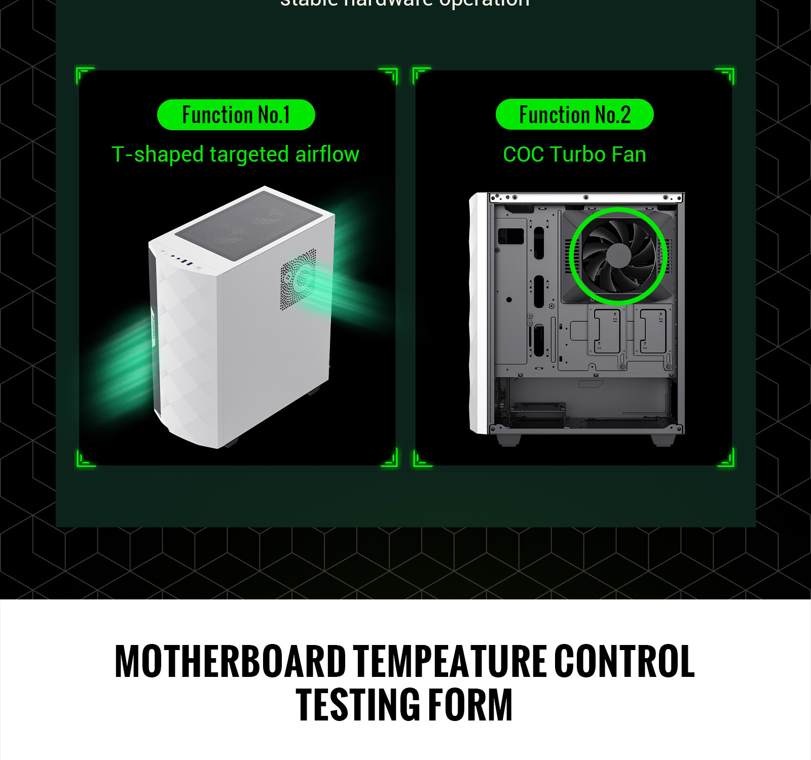 • COC Cooling: Active Turbo Fan with T-Shaped Air Intake ensures direct motherboard cooling and better heat dissipation.