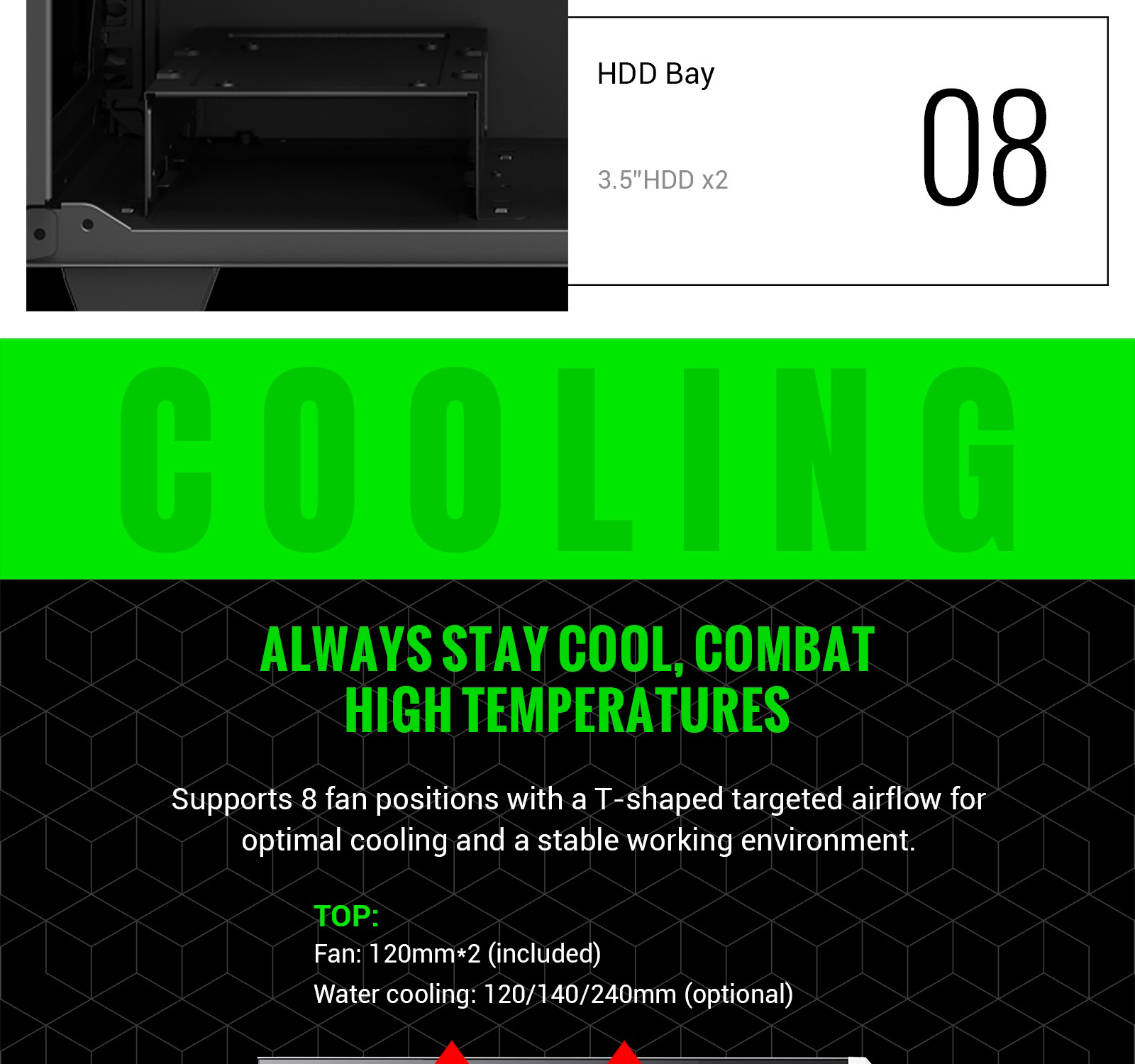 | Cooling Fan Support | Front | 3x120mm,2x140mm(Fan optional) |