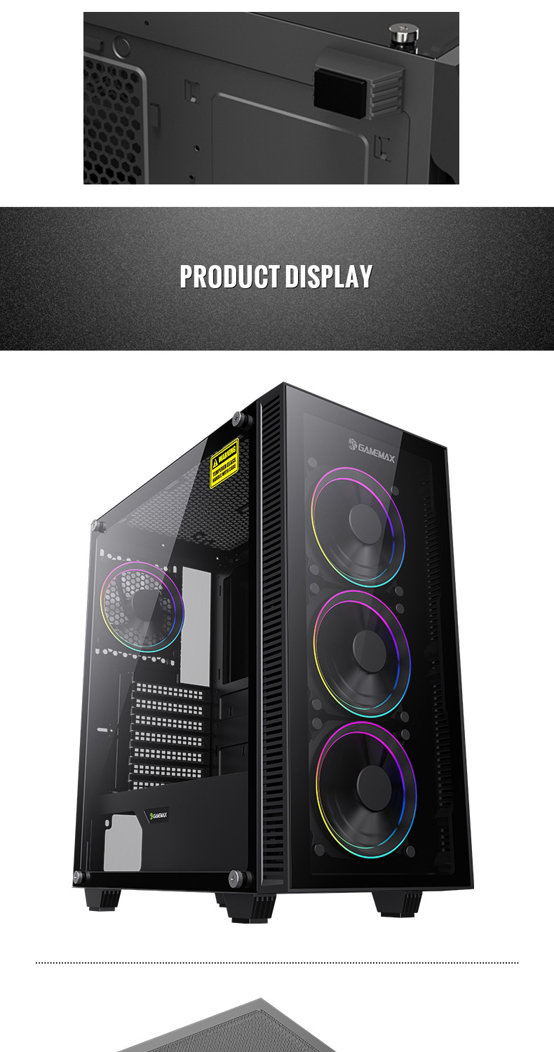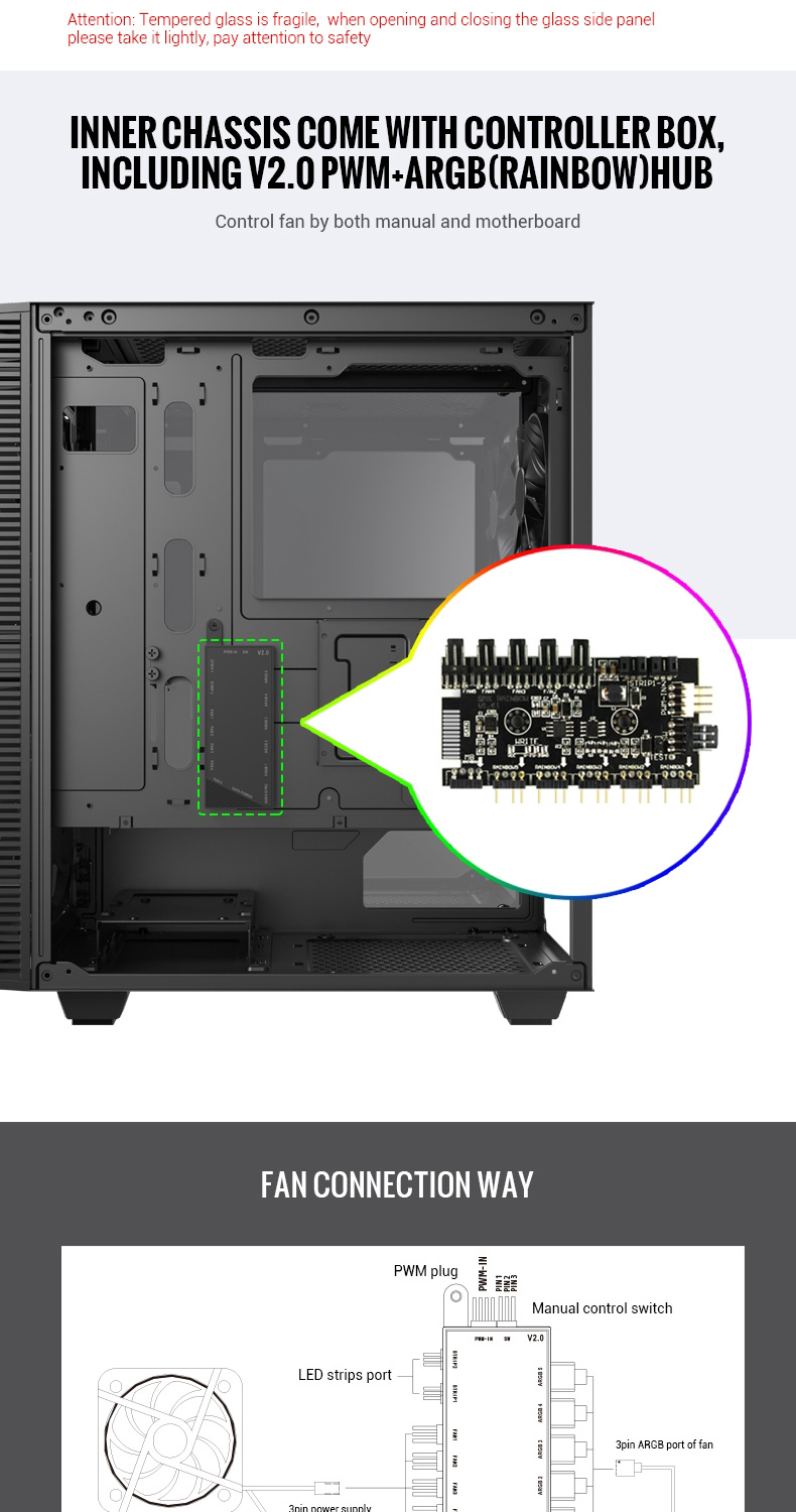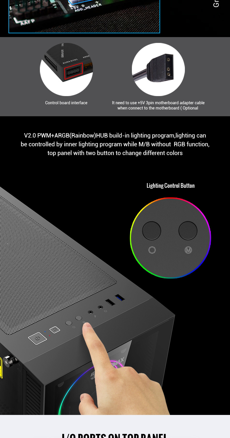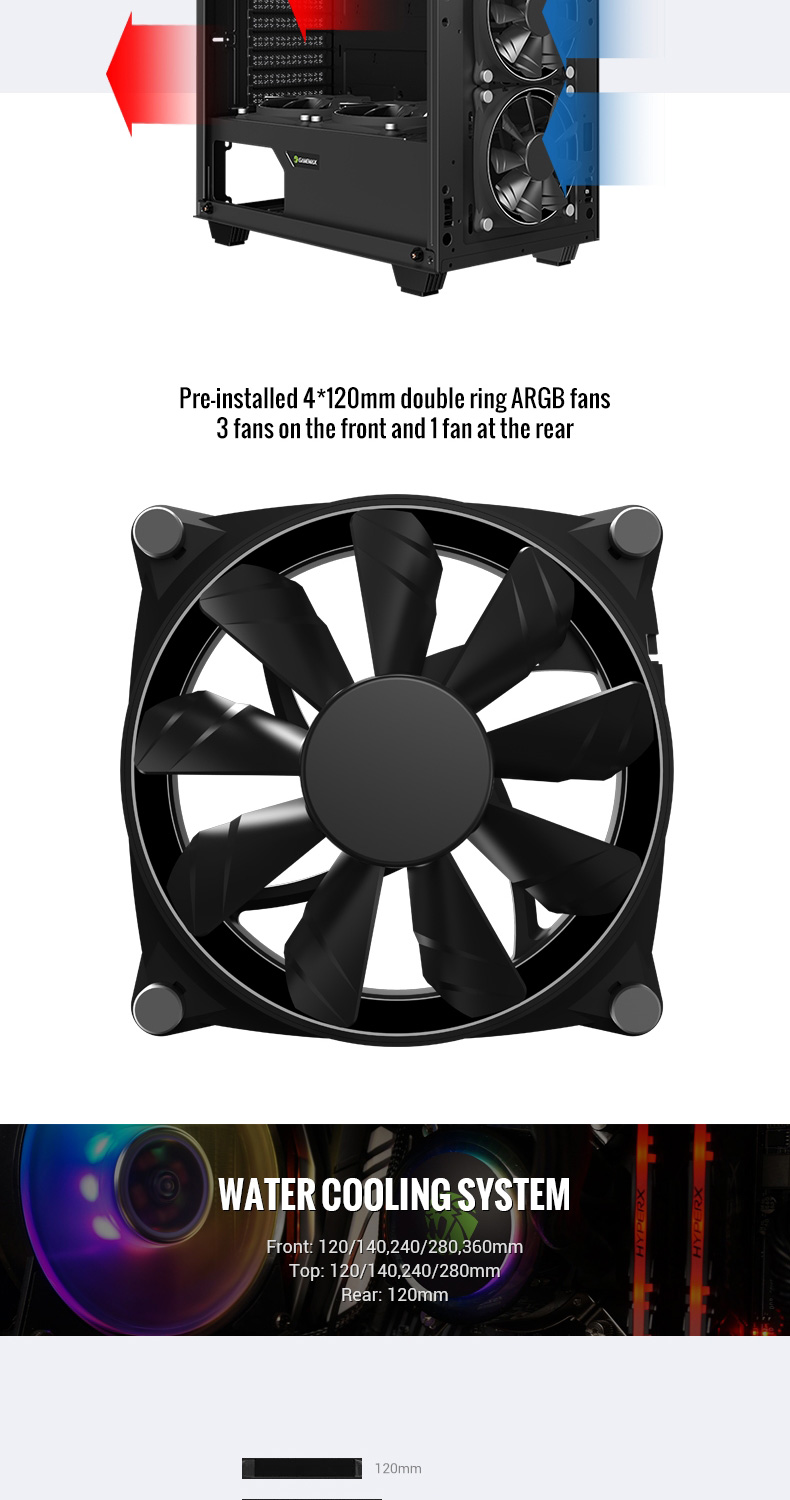 The front panel is pre-installed 4x120mm Dual ring fan with ARGB light mode controlled via build-in HUB, It gives big air flow and excellent effect and the spectrum LED strip inlayed to give this case the perfect balance between style and RGB