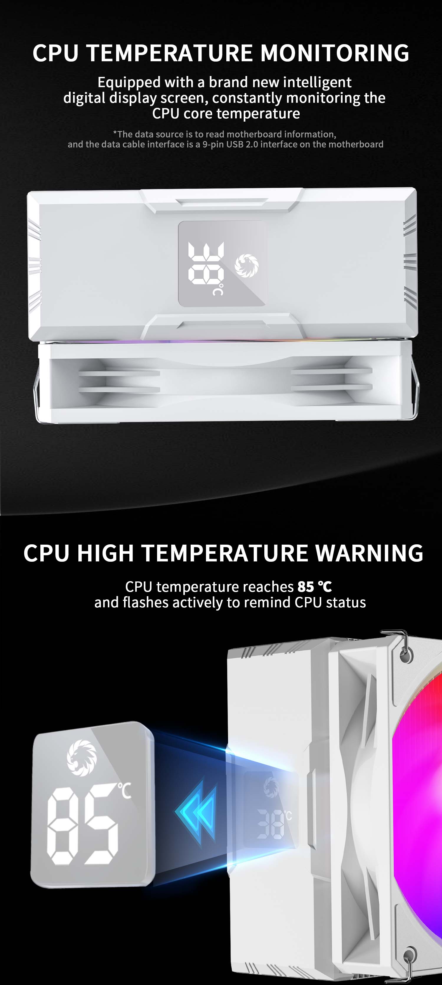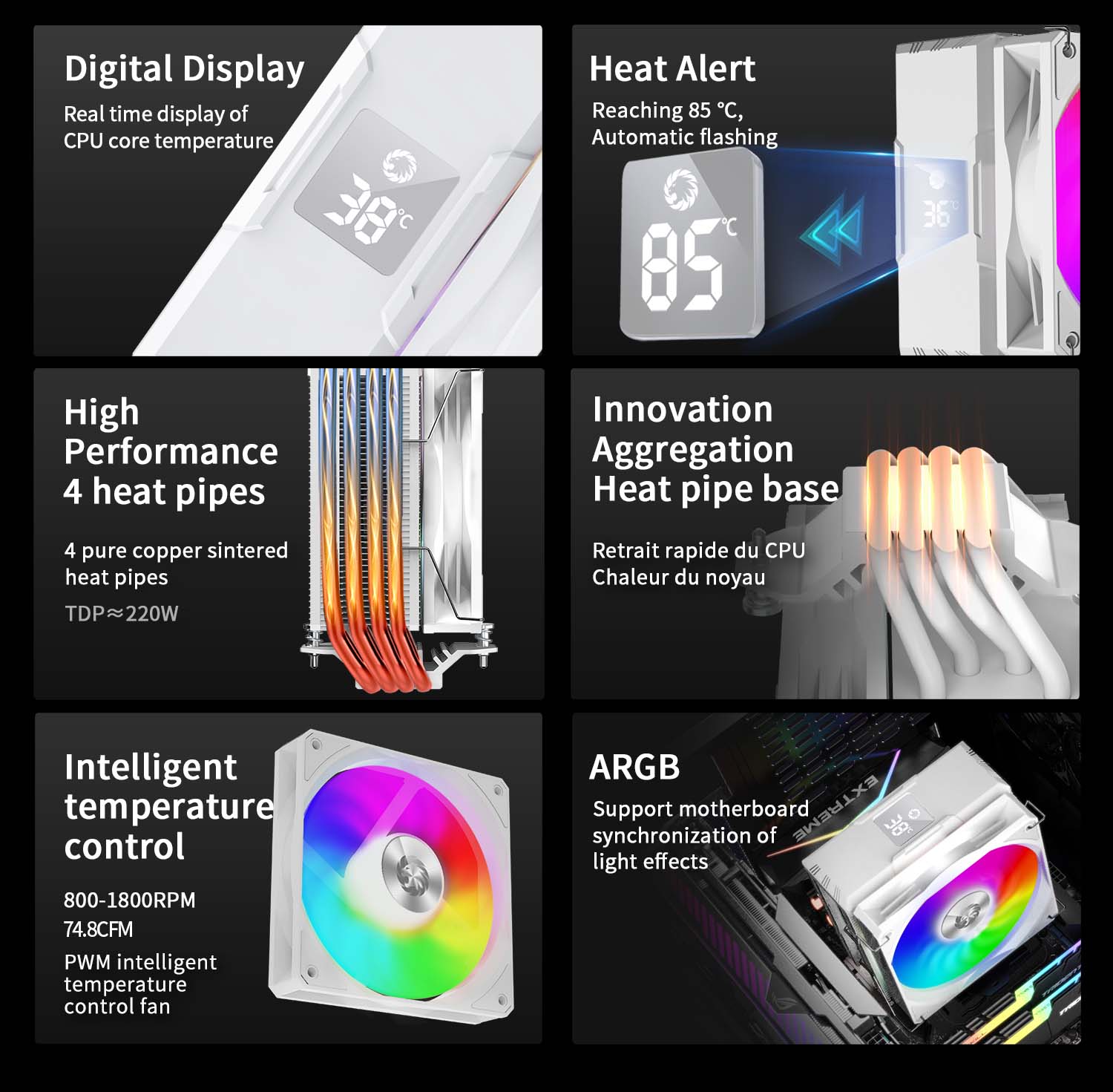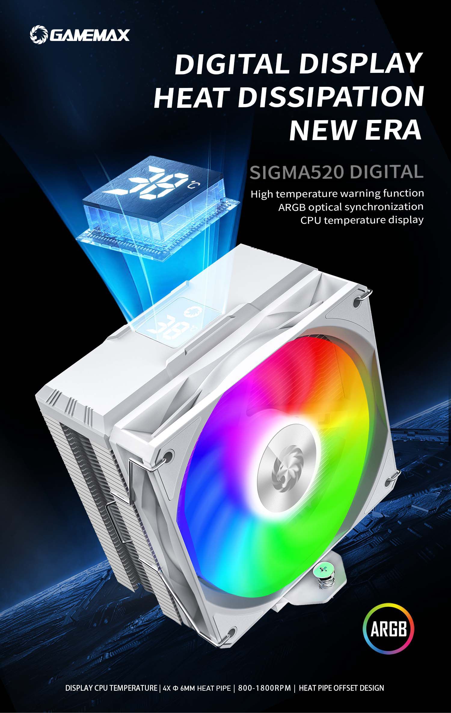 Gamemax Sigma 520 Digital WH Tower CPU air cooler, Painted White, Fours thermal tubes, Supports Intel Gen12,13 CPUs and AMD latest model, ARGB lighting effects