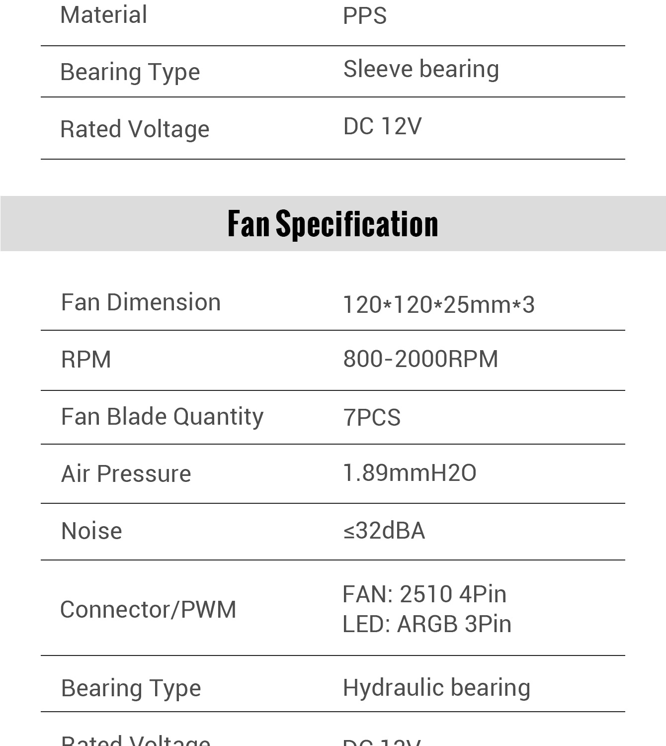 Bearing TypeHydraulic bearingConnector/PWMFAN  4pin ARGB 3pinStart Voltage≥6V