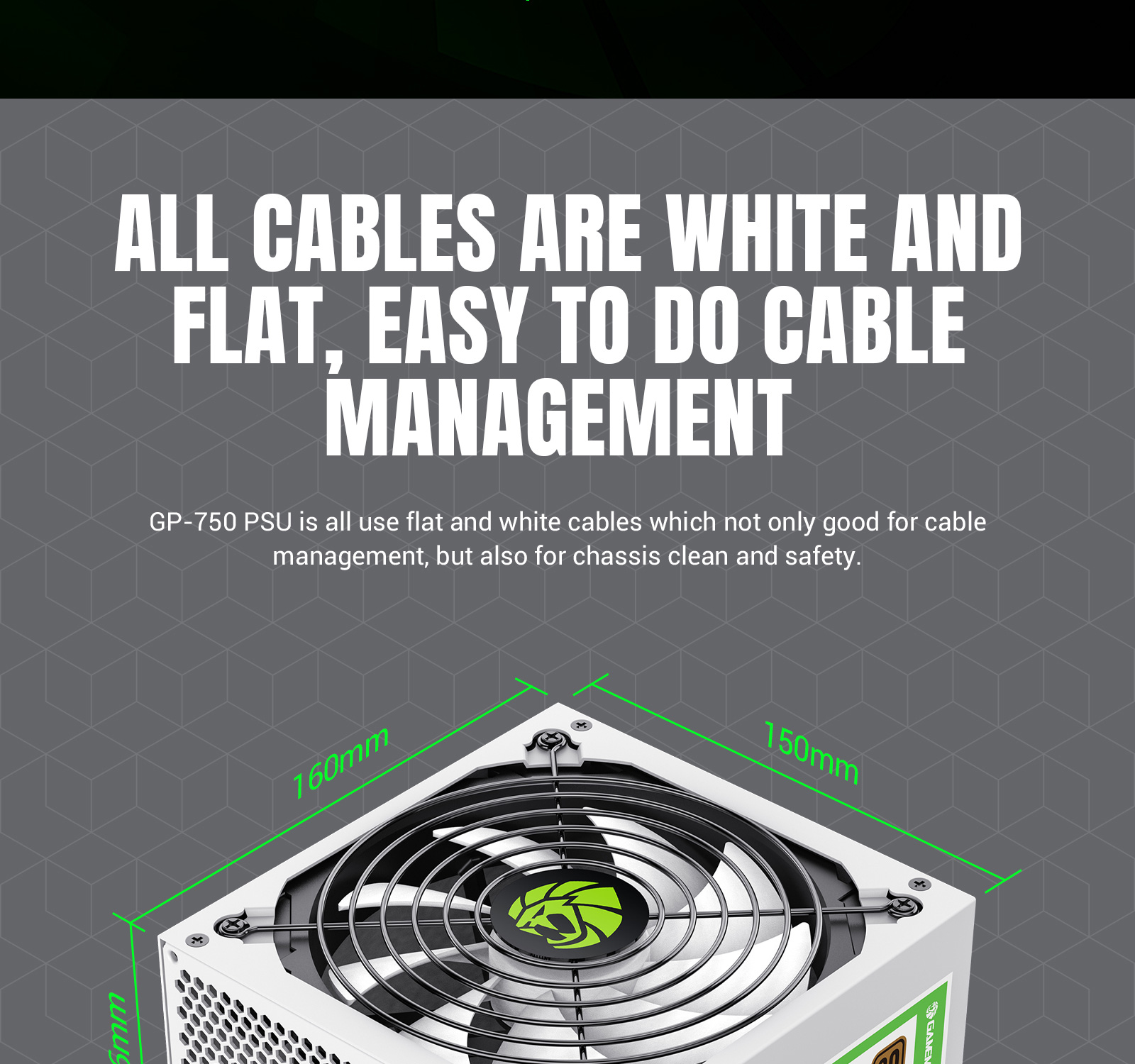 • Engineered with high-end components, Elegant black PSU casing with white flat cable.