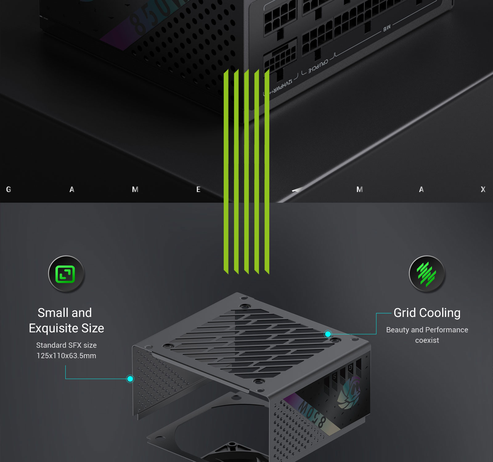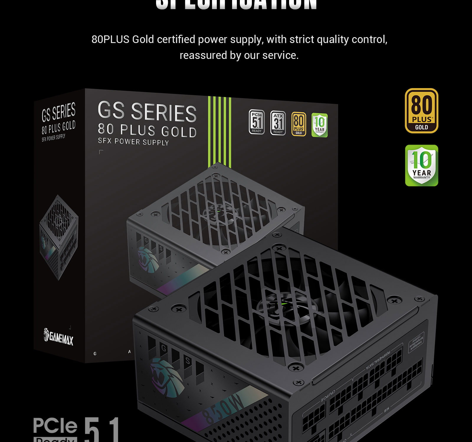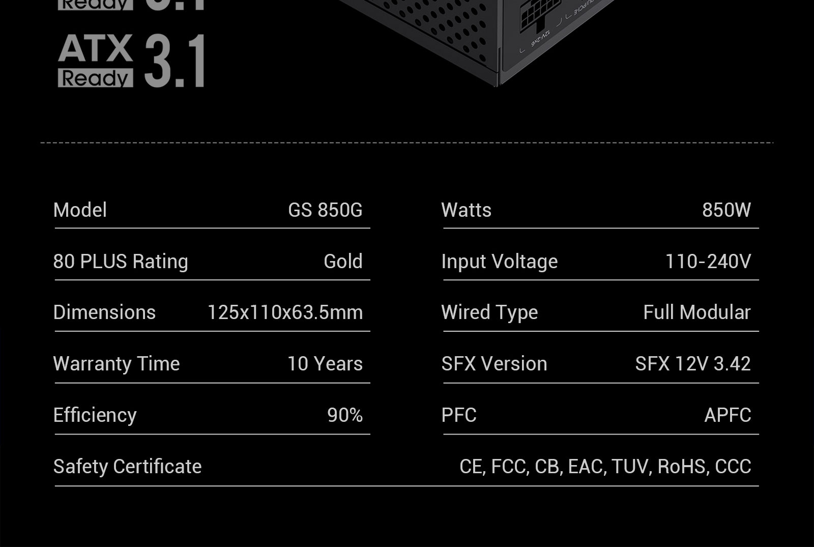 GS 850G 80 Plus Gold Certified SFX Power Supply with Intelligent Cooling, Japanese Capacitors, and Comprehensive Protection
