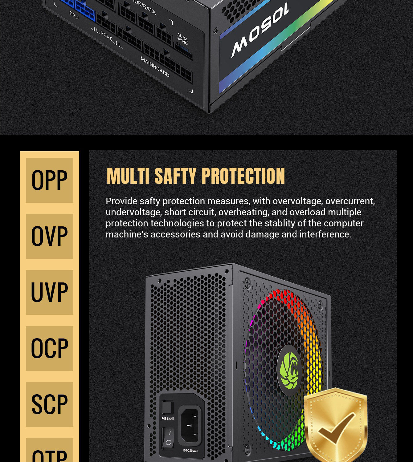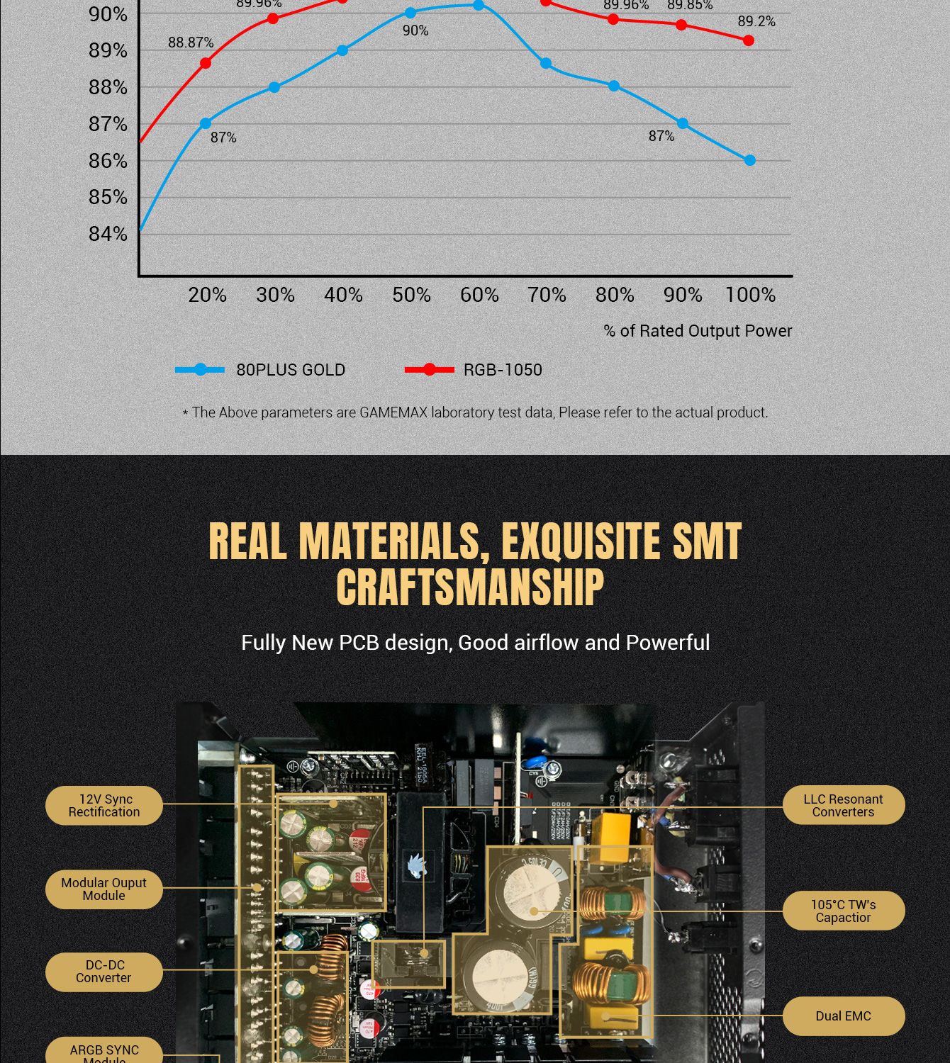 • 80 Plus Gold Certified: RGB-1050 PRO uses the main Japan Capacitor with 90% efficiency or higher under typical loads