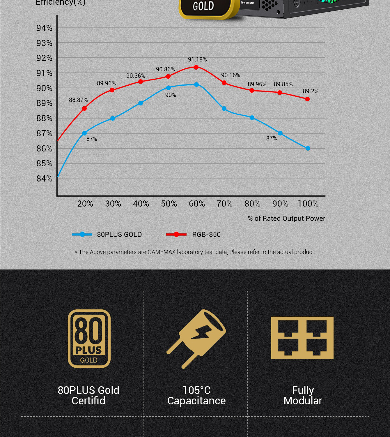 • 80 Plus Gold Certified: RGB-850 PRO uses the main Japan Capacitor with 90% efficiency or higher under typical loads