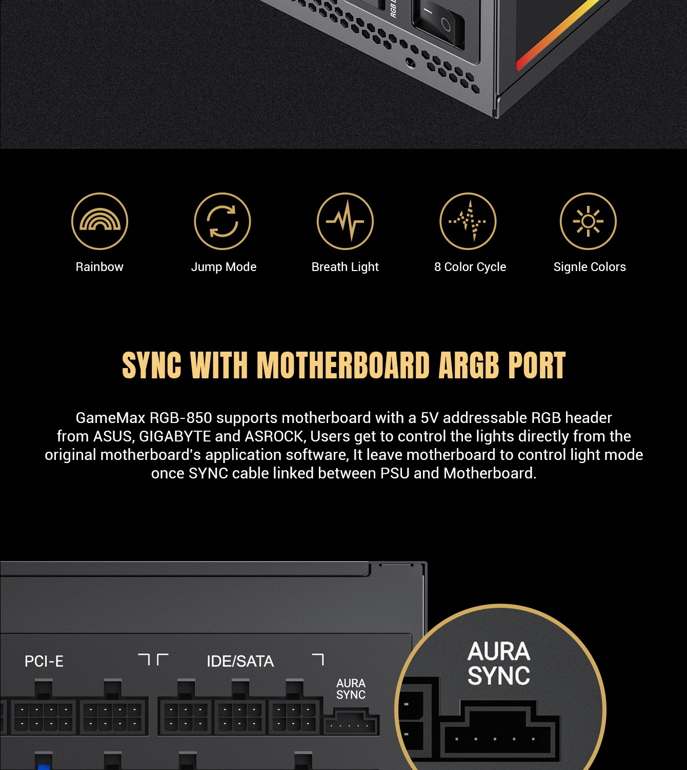 GameMax RGB-850 PRO Fully Modular 80+ Gold Certified,12V SYNC Rectification design for Powerful single +12V rail helps ensure a stable and reliable supply to other PC components