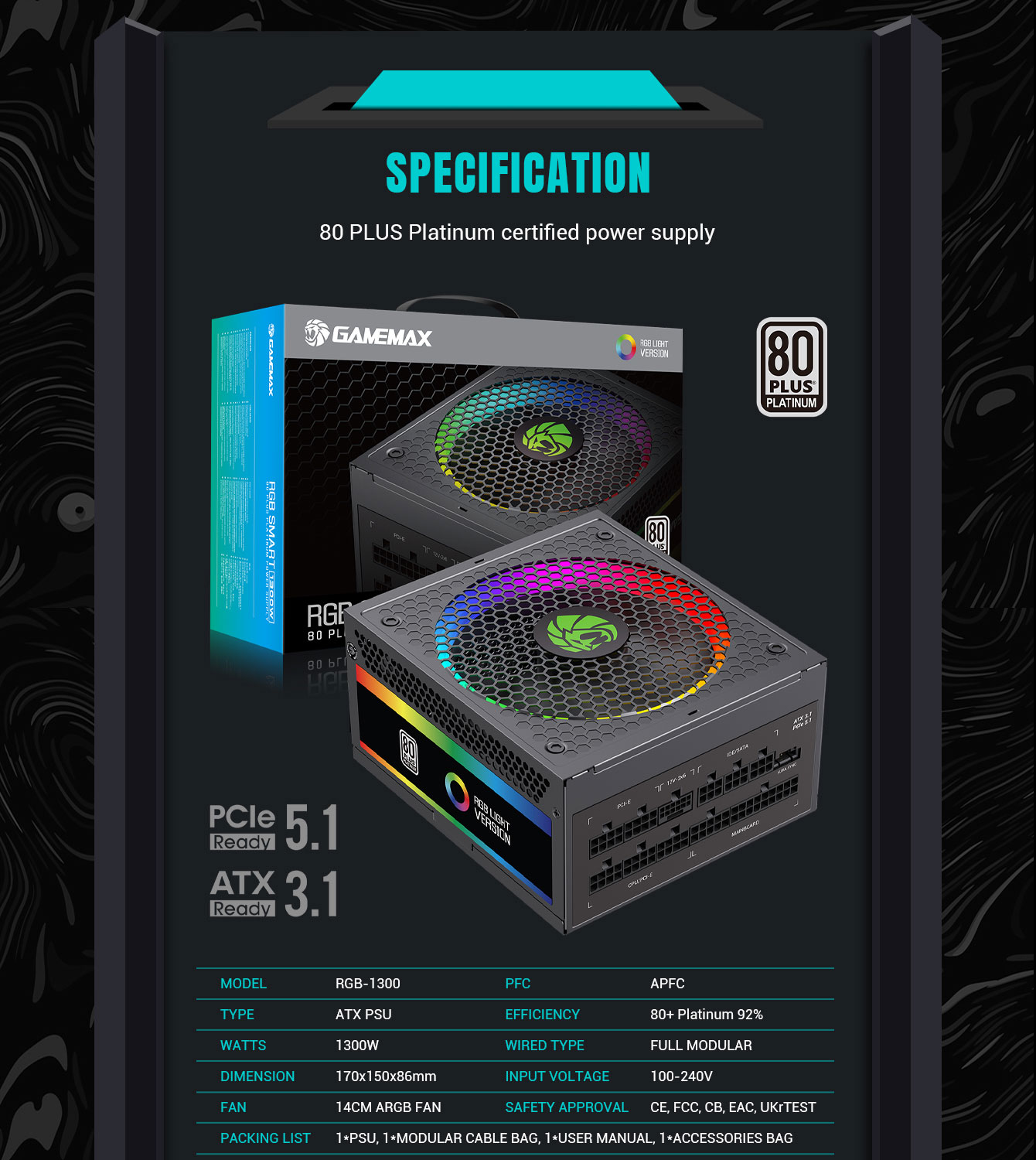 GameMax RGB 1300w PC power supply, 80 Platinum Certified,modular power supply