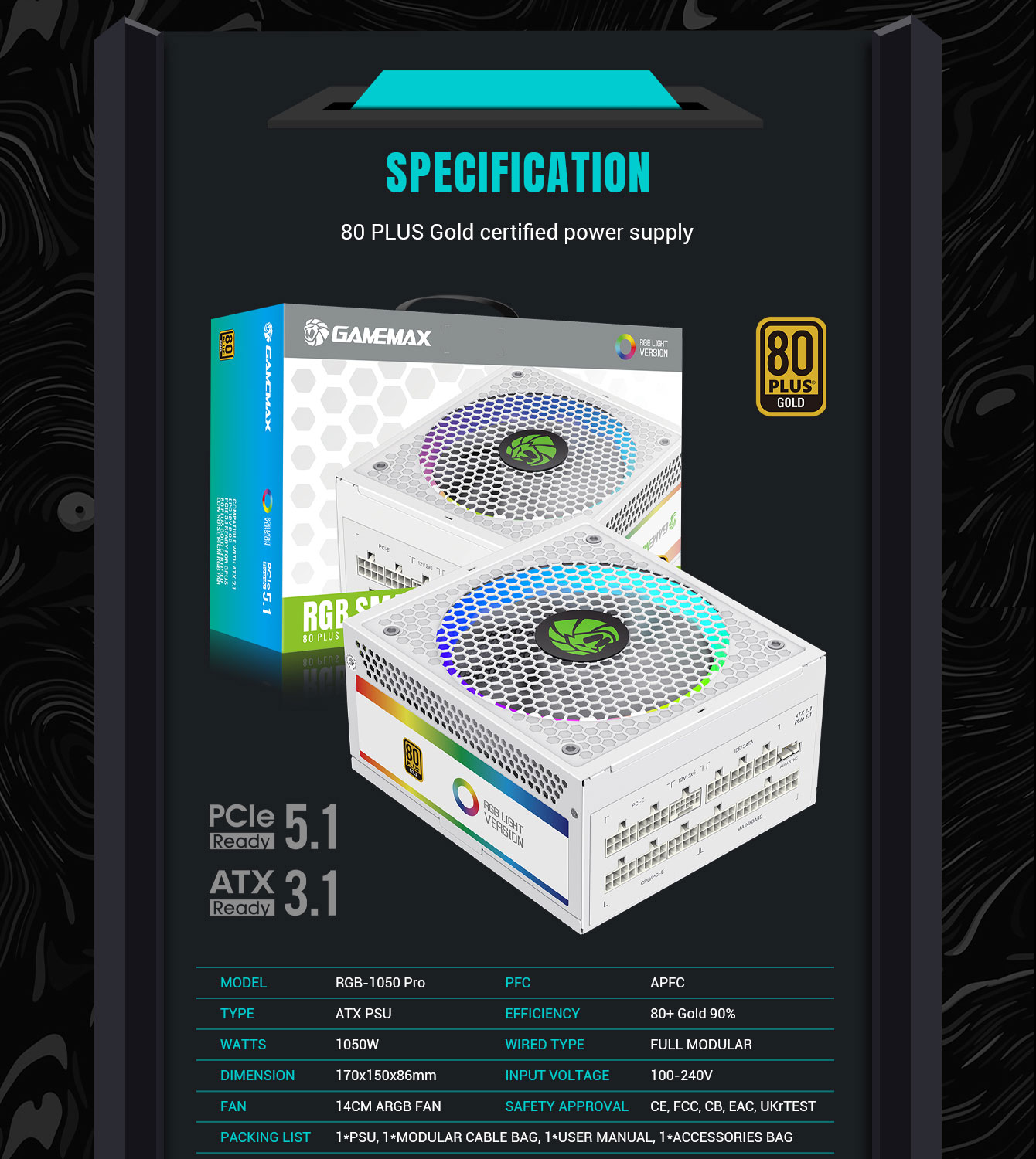 • 1050W Power: Fully modular, 80+ Gold Certified, 90% efficiency