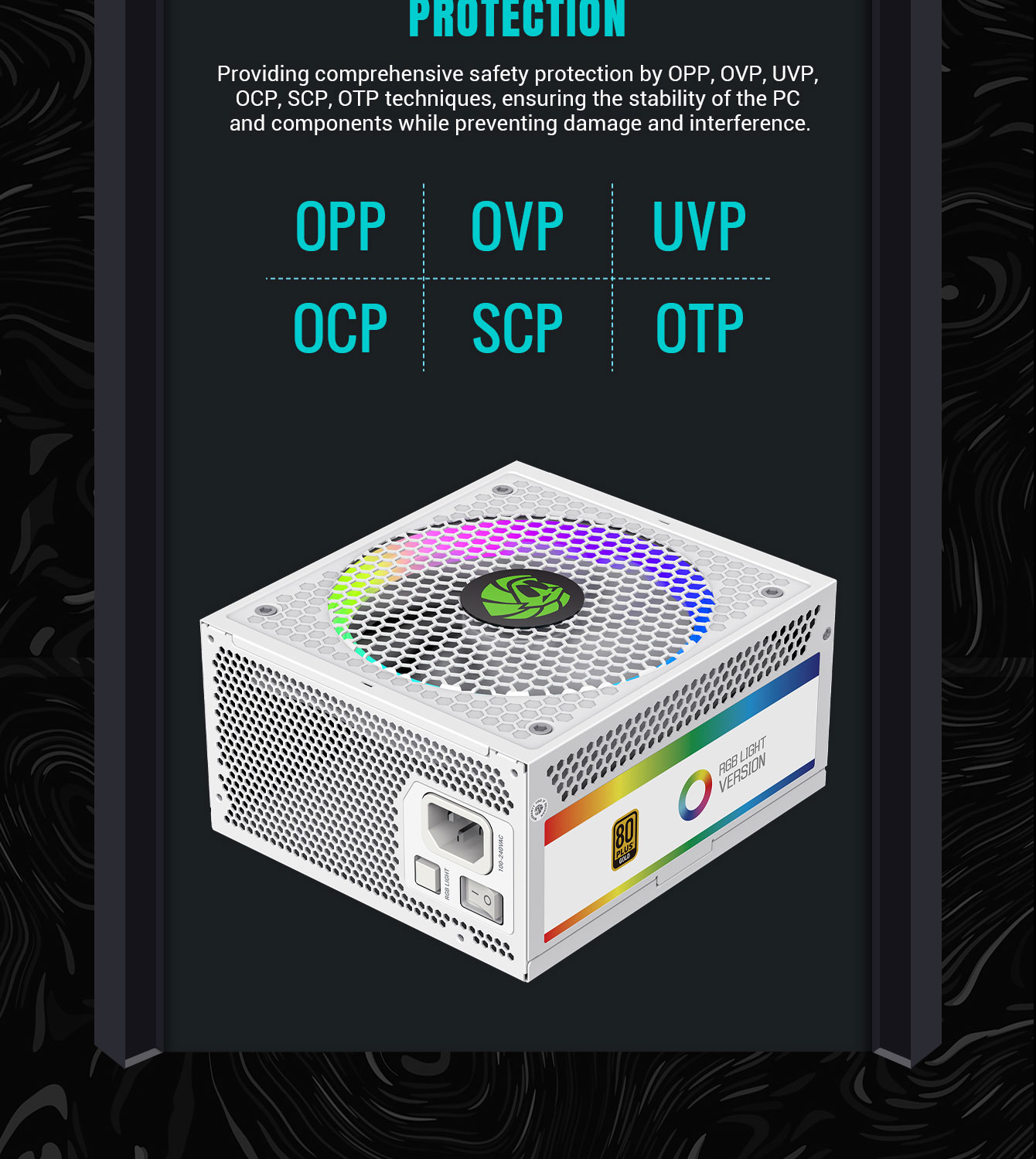 • Comprehensive Protection: OPP/OVP/UVP/SCP/OCP/SIP for stability and safety.
