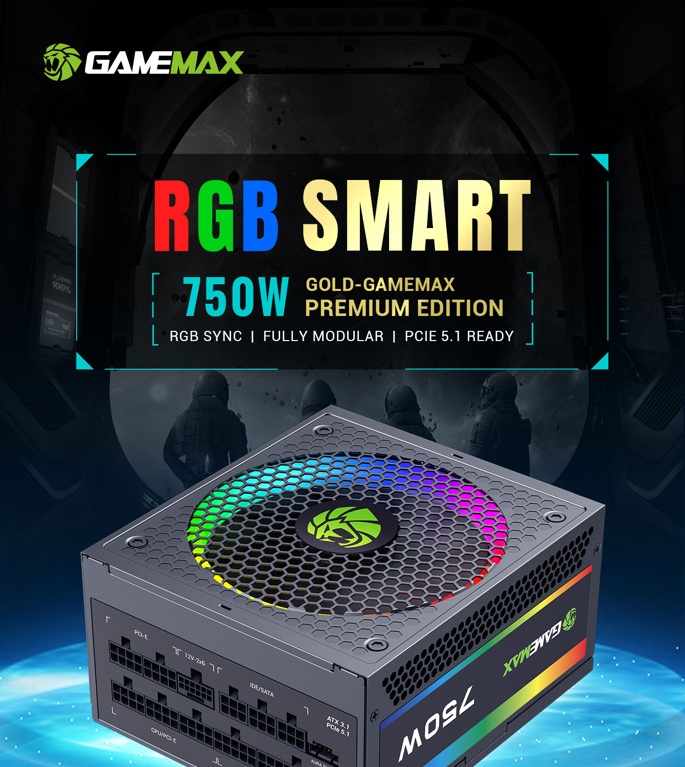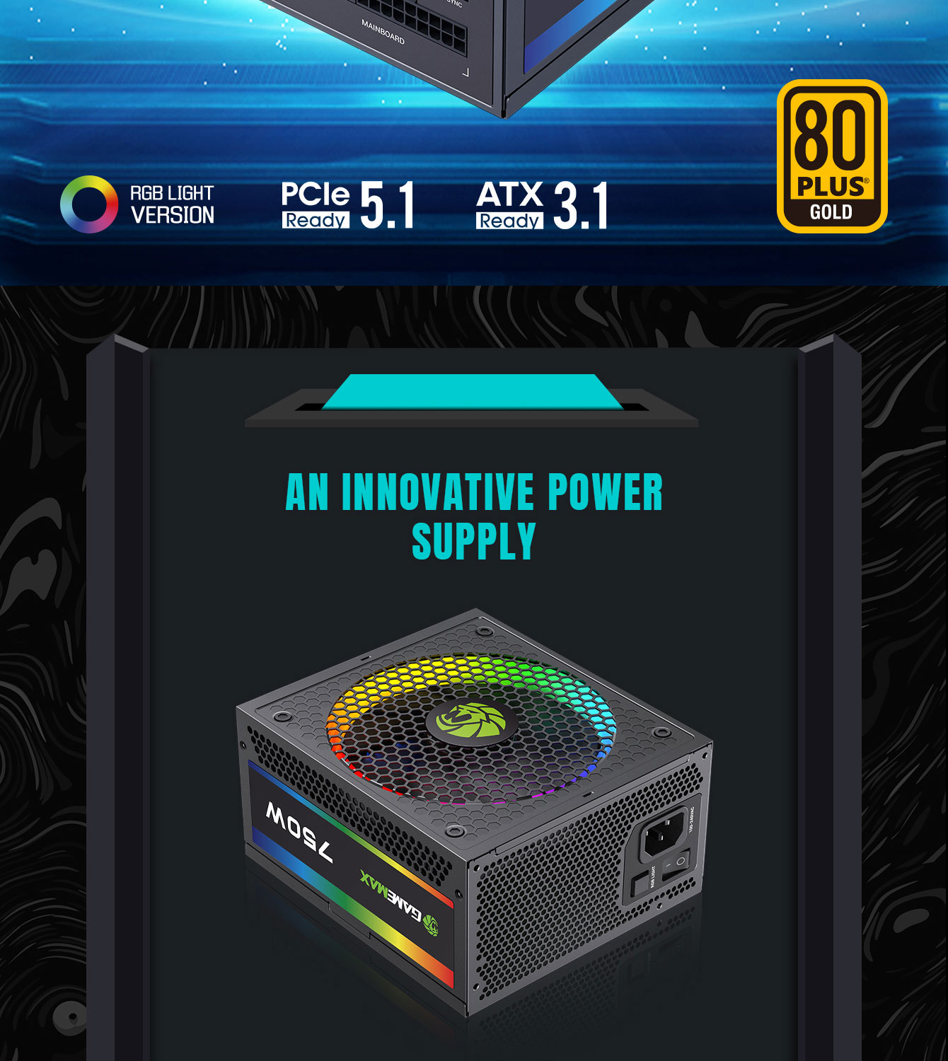 Power Supply RGB-750 PRO Fully Modular 80+ Gold Certified with RGB Light Mode ARGB SYNC.