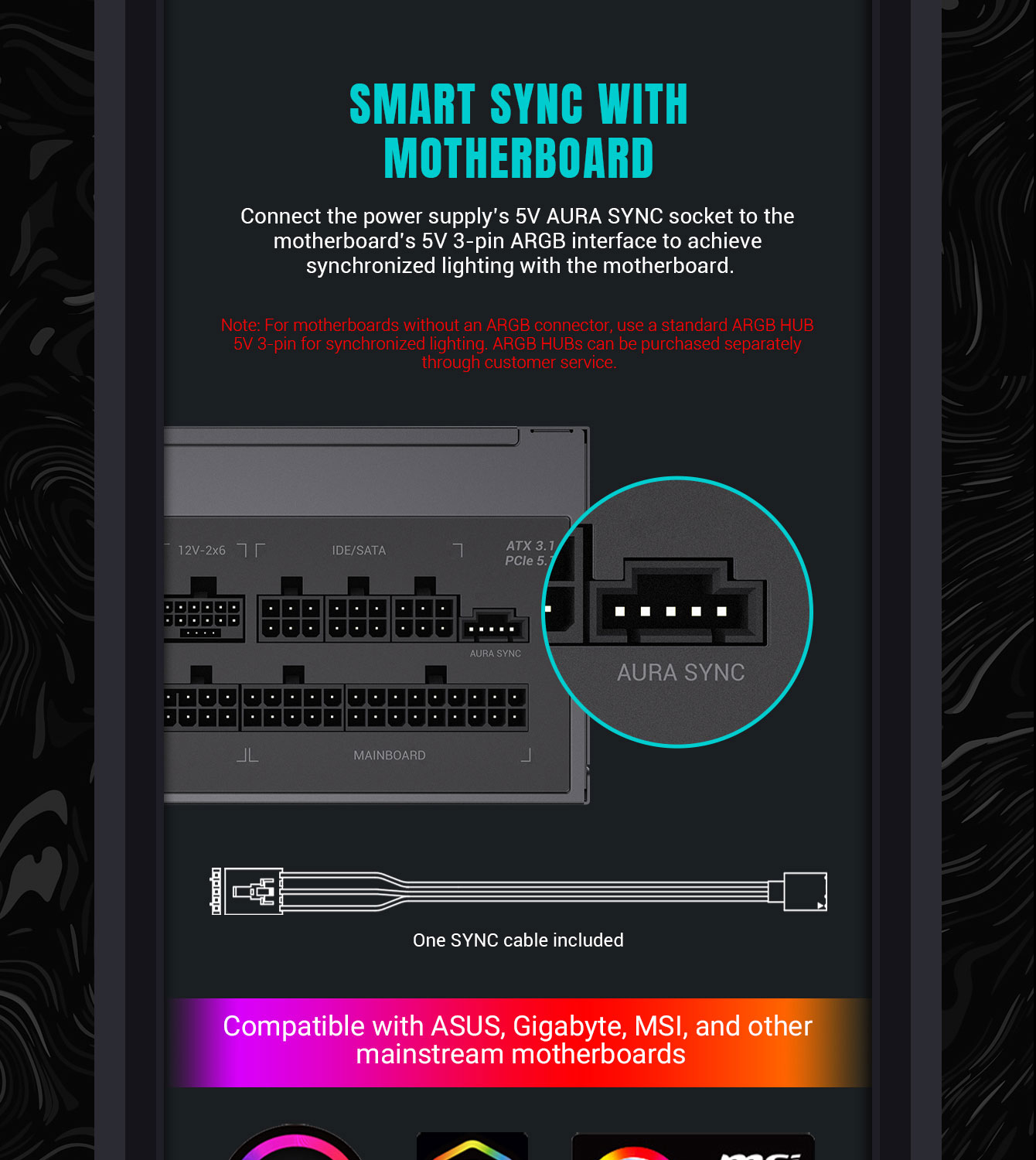 | ARGB SYNC | Access external ARGB HUB or 5V 3pin signal from motherboard |