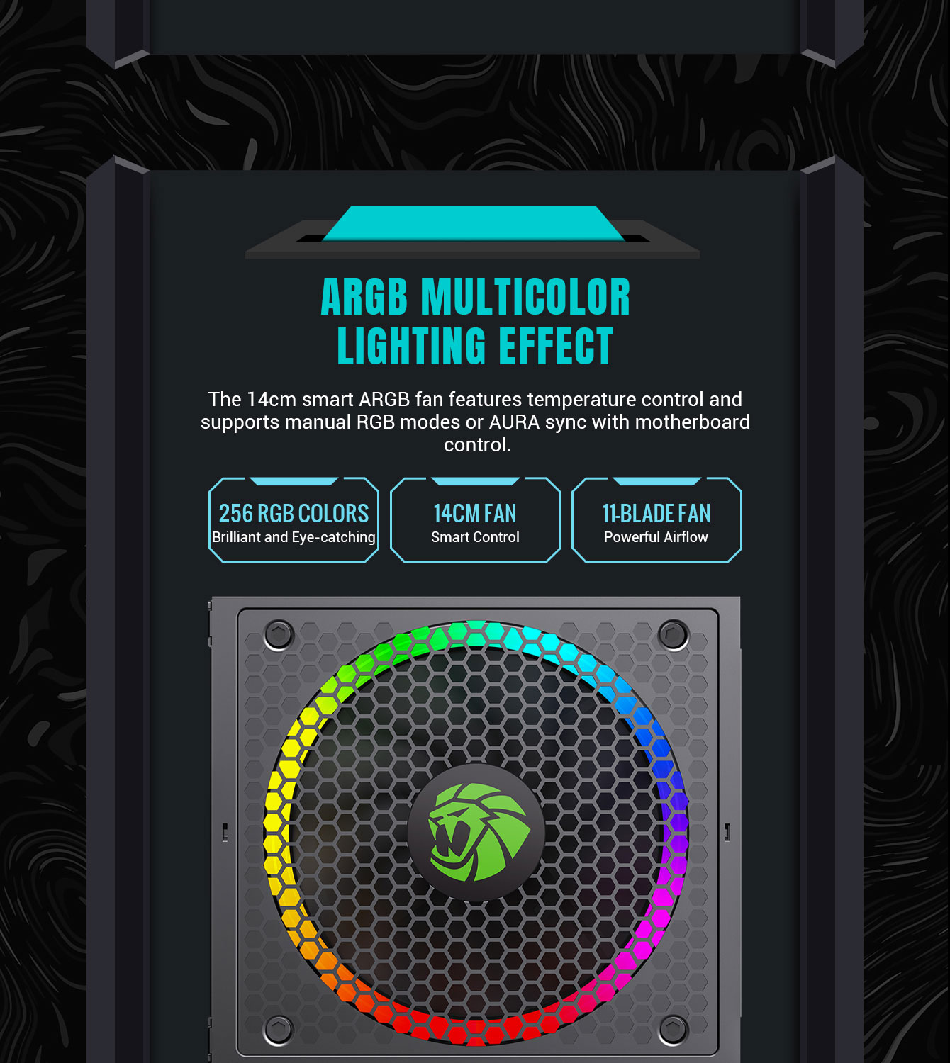 • RGB Lighting: 140mm ARGB fan with 25 lighting modes, syncs with major motherboard brands.