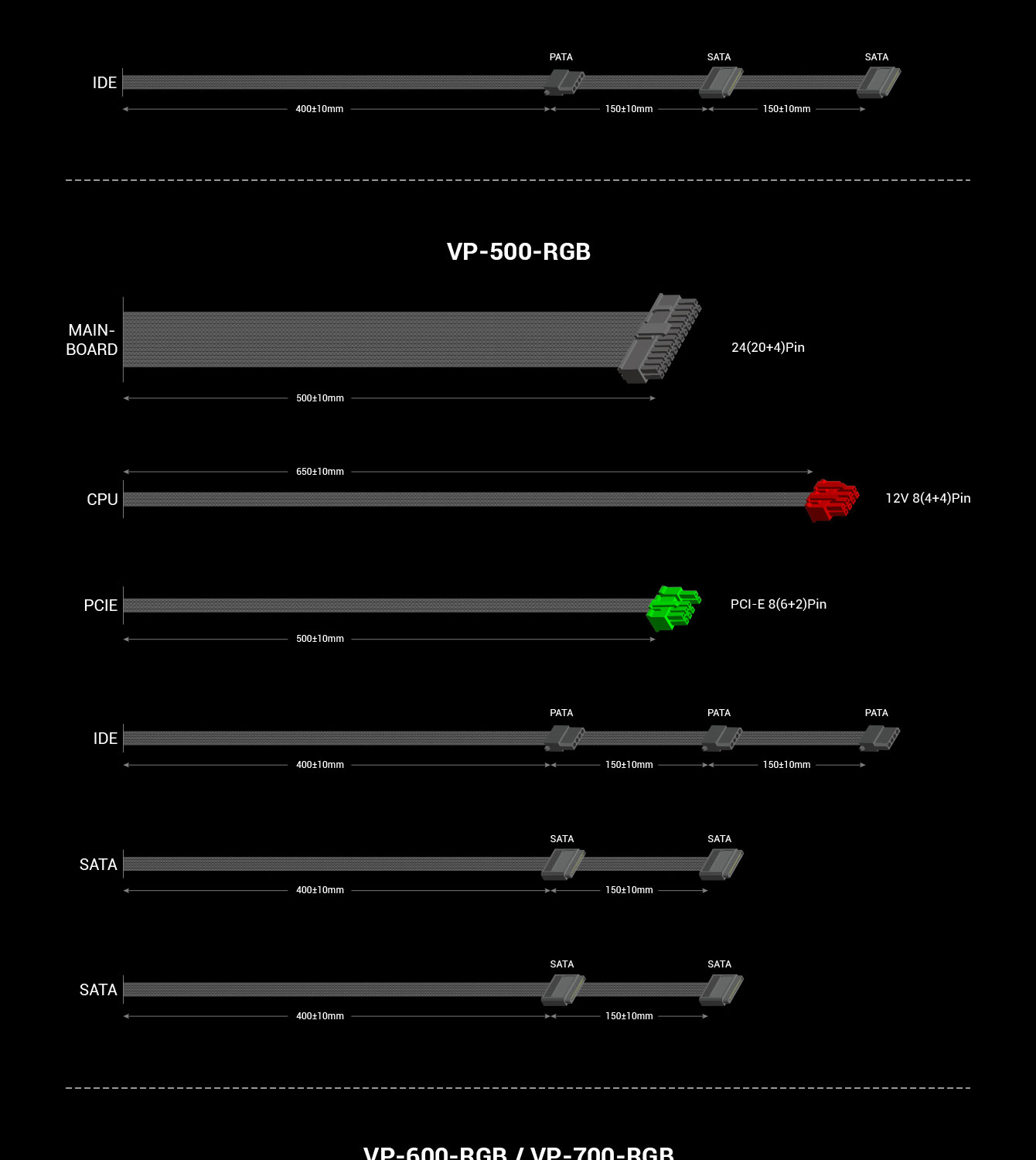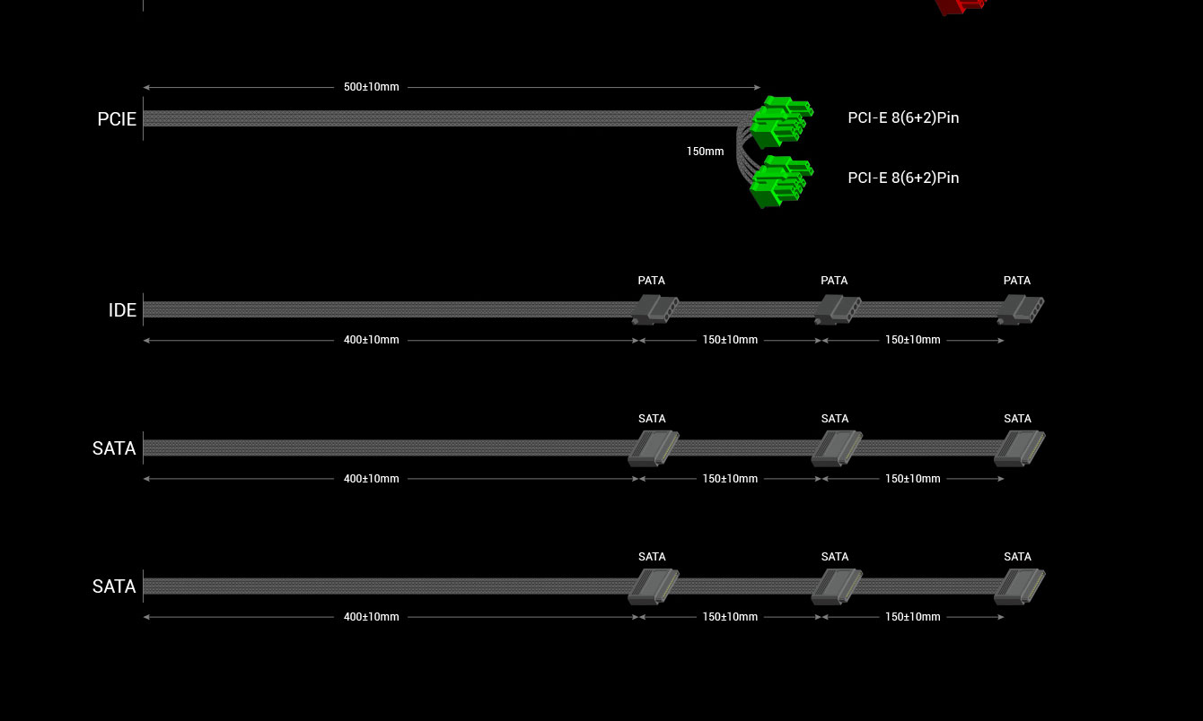 | Cable type | Black tube shield along with colors CPU and PCIe connecor | |