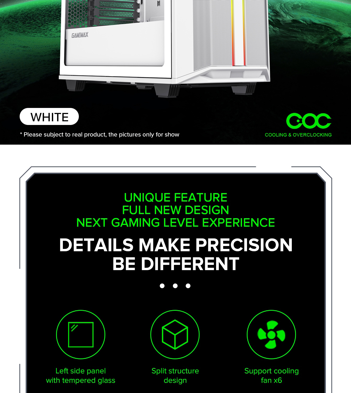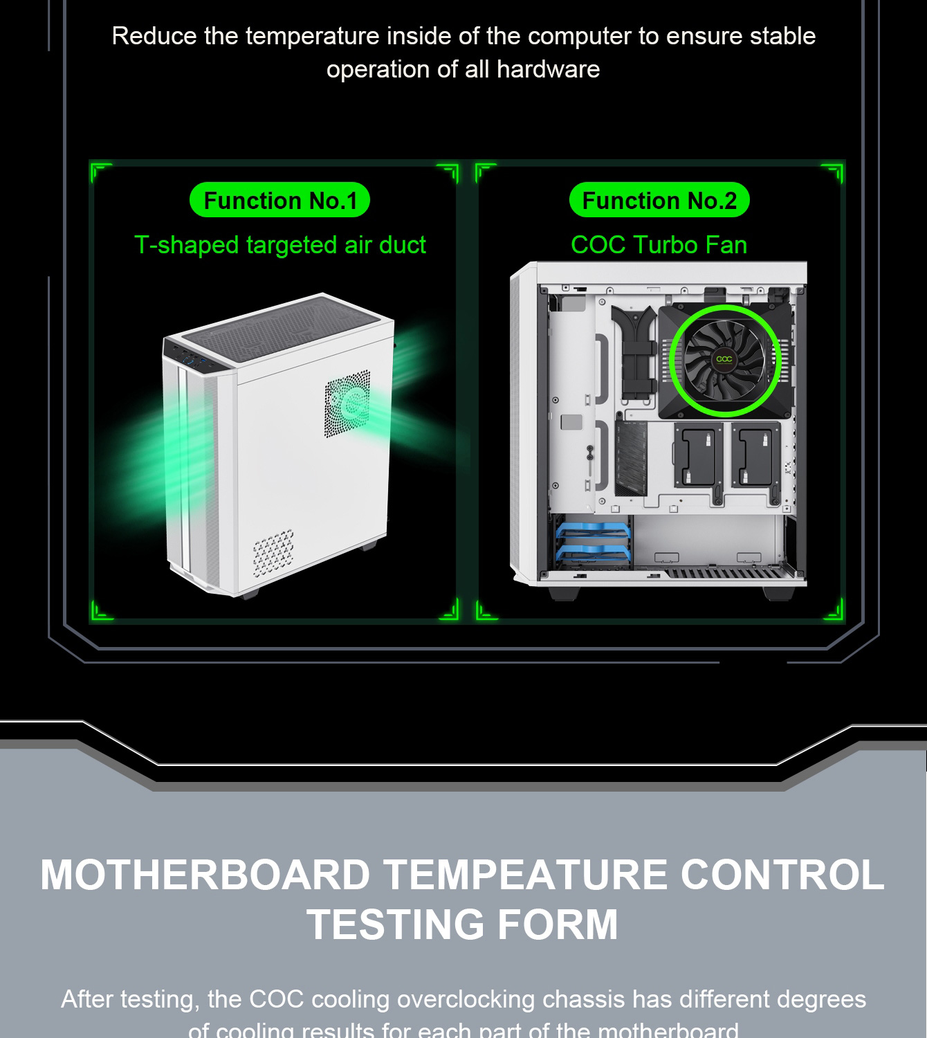 • COC (Cooling Overclocking) turbofan, T-shaped directional air duct, active cooling system, exclusive patented design