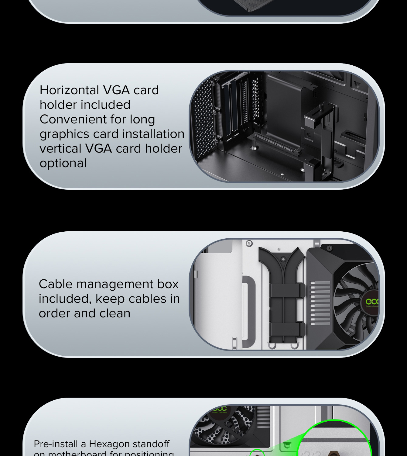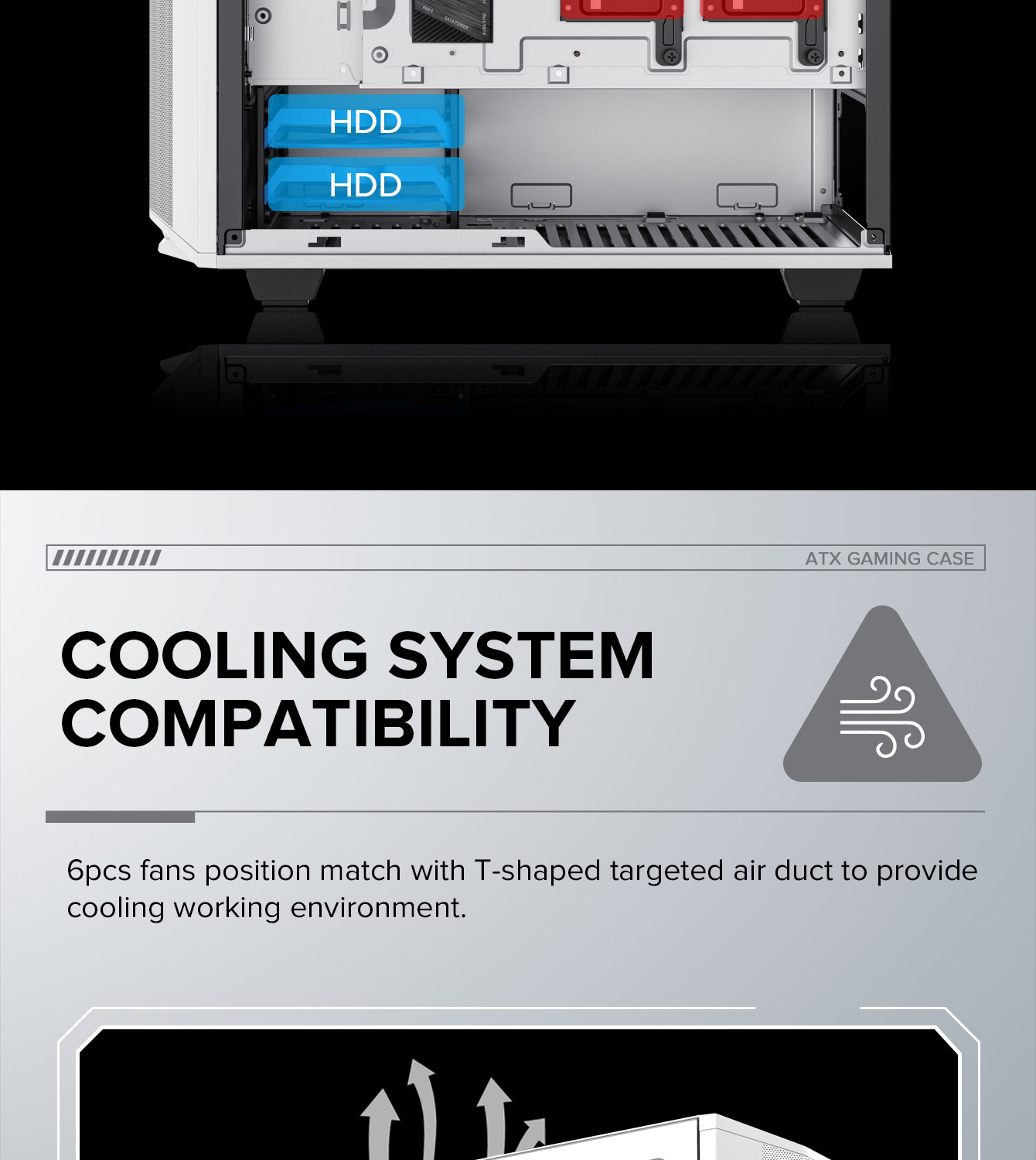 • Upgrade the top plate, increase the height of the chassis, and solve the problem of mutual interference between the water cooling of the upper plate and the high bracket of the memory RGB cover