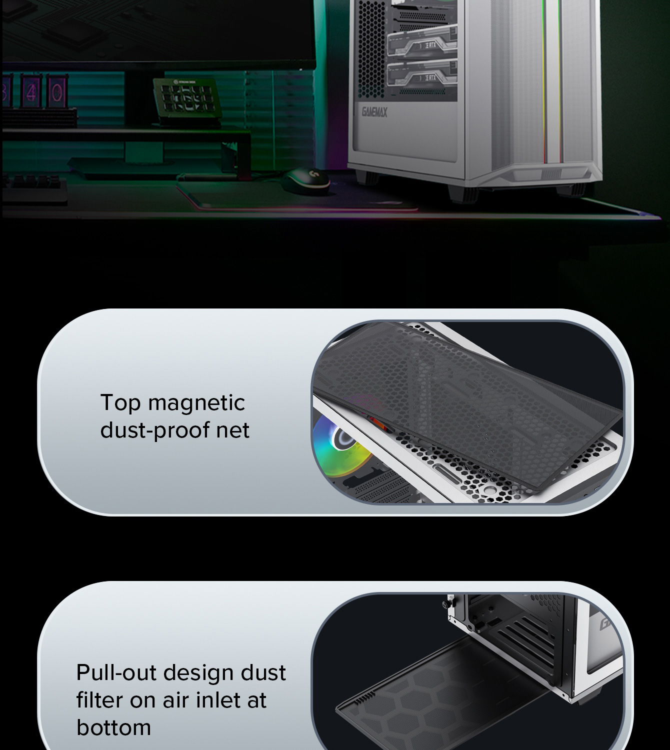 • The all-metal mesh front panel is designed in one piece, and the dust-proof hole design is fully covered, focusing on the cooling airflow