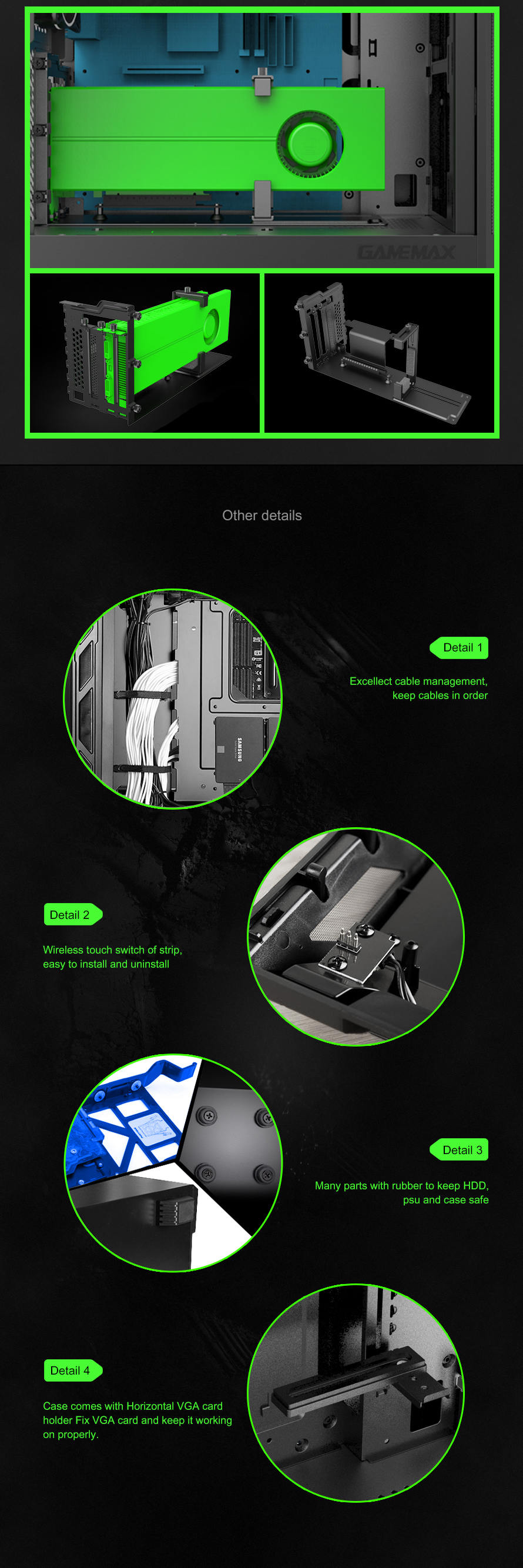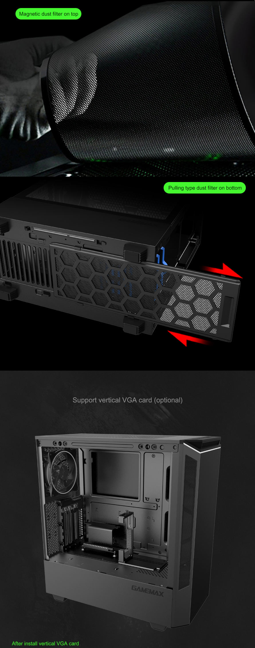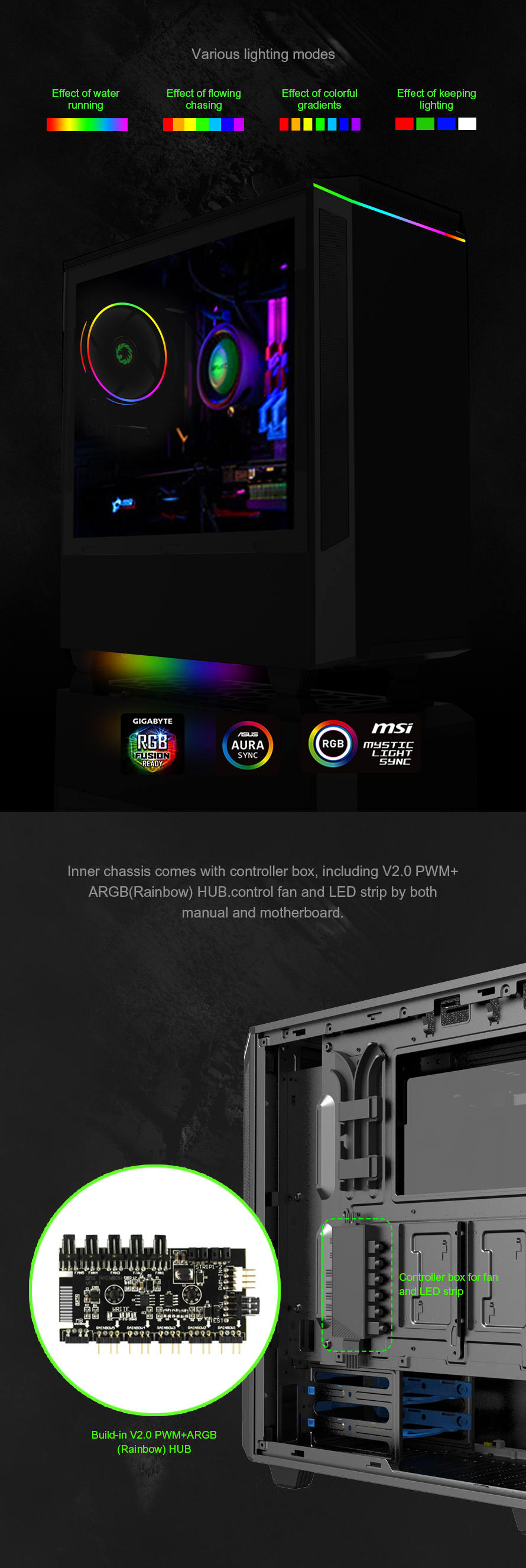 • You can effortlessly control ARGB lighting and fans via GameMax V2.0 PWM+Rainbow HUB controller pre-installed, while Adaptive Noise Reduction optimizes via PWM controls