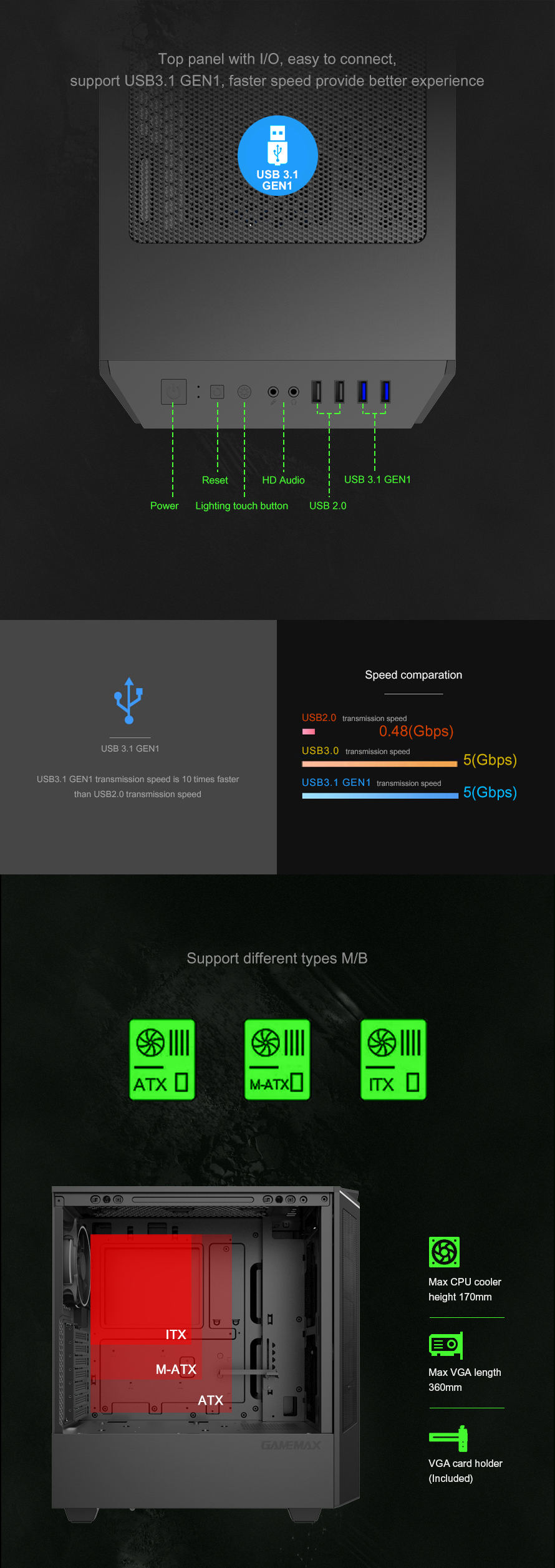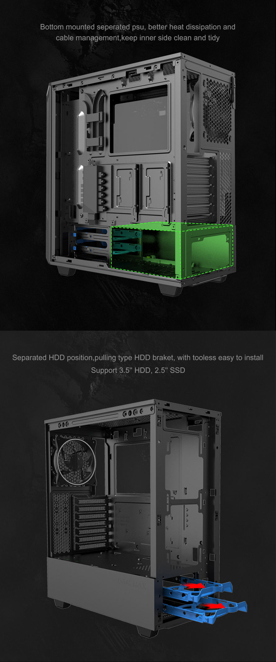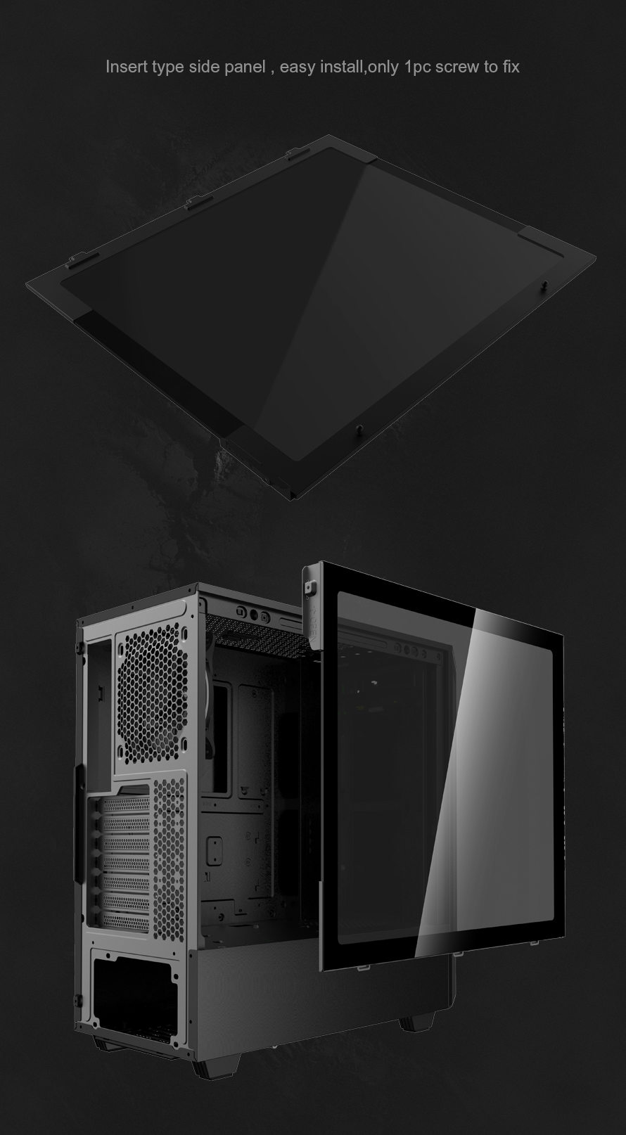 • The Paladin T801 compact mid-tower case features a unique one-pcs screw easy open glass side window, and along with top and bottom ARGB strips