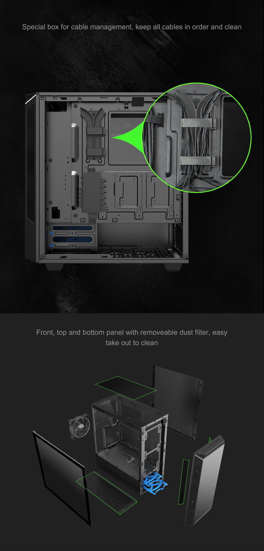 | Top Panel | Mesh for better heat disspation with easily accessible dust filter | |