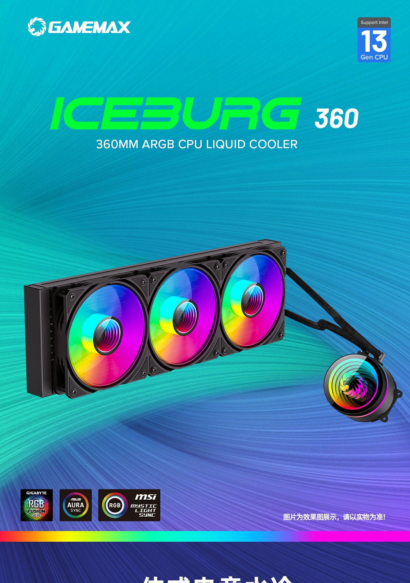 GameMax ICEBURG 360液体CPU冷却器360mm可寻址RGB和PWM泵和风扇300W TDP AIO水冷器,适用于Intel LGA 1700/1200/115X AMD AM5/AM4