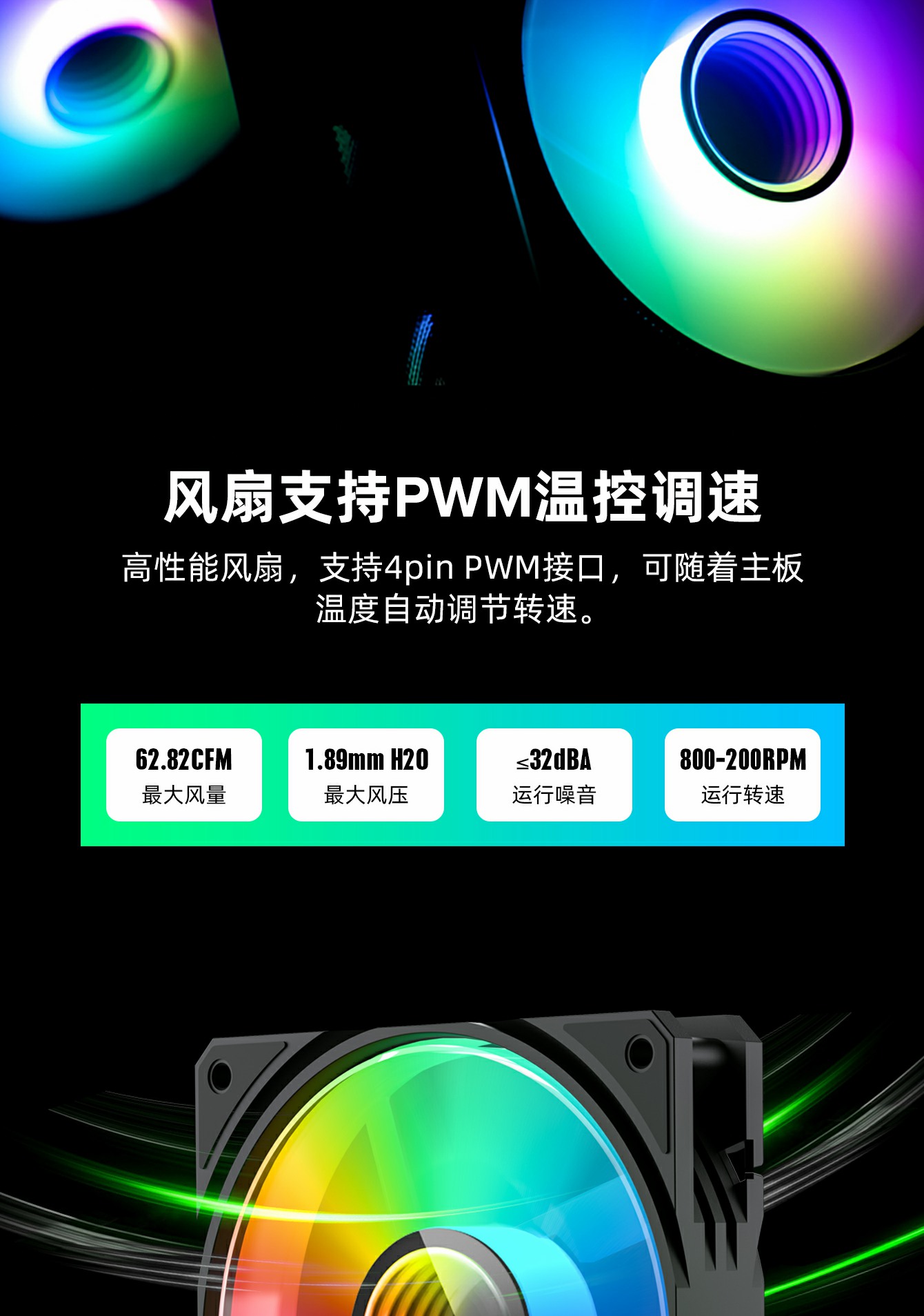 三个ARGB风扇-3x 120mm ARGB PWM风扇提供出色的压力和气流,同时产生非常小的噪音。(注意:在液体冷却器运行之前,必须在BOIS中设置PWM模式,否则风扇将以全速或低速的固定速度运行)