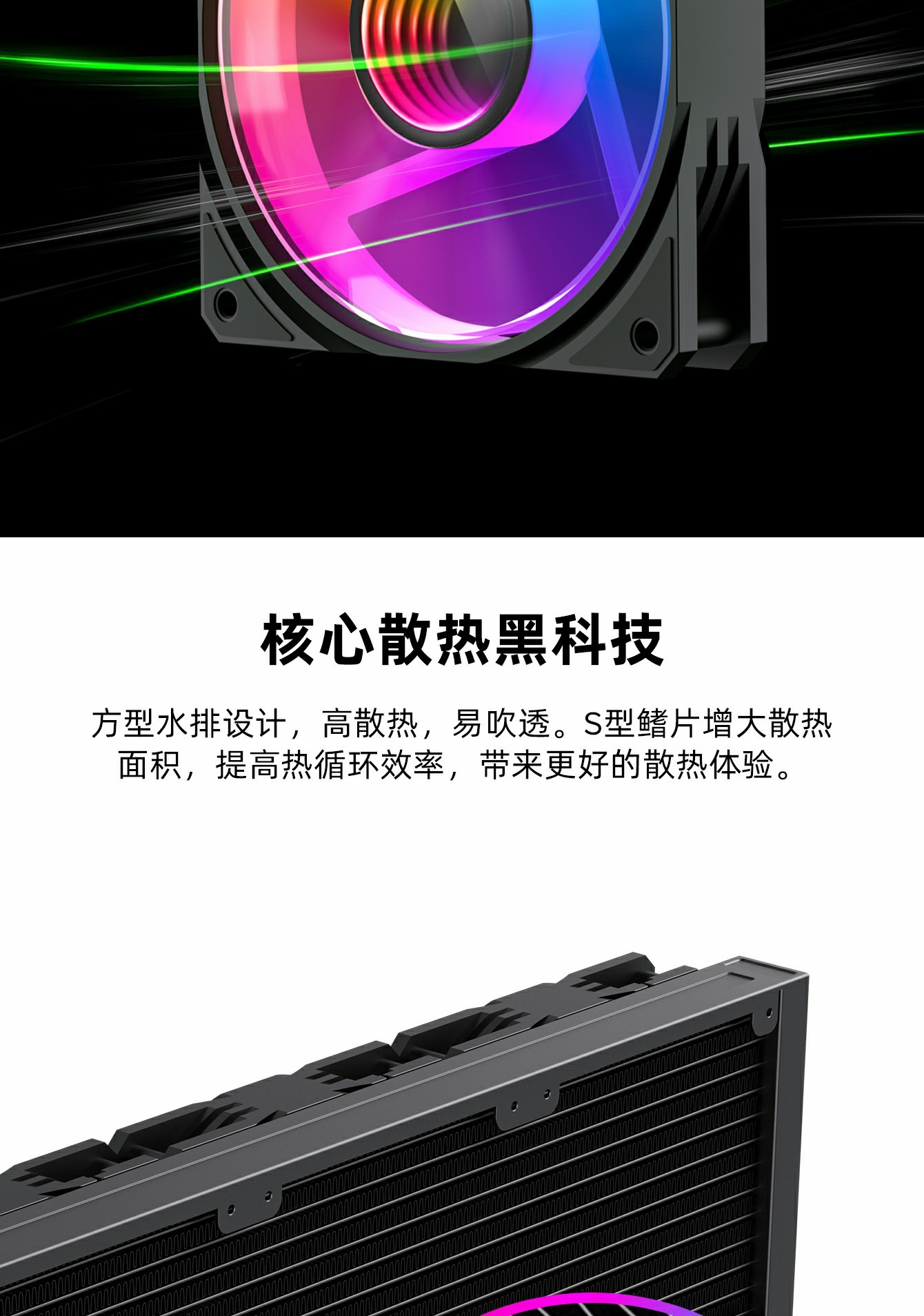 可寻址RGB同步:风扇和泵上的可寻址RGB照明可以通过5V 3引脚接口与主板同步,提供均匀而丰富的照明