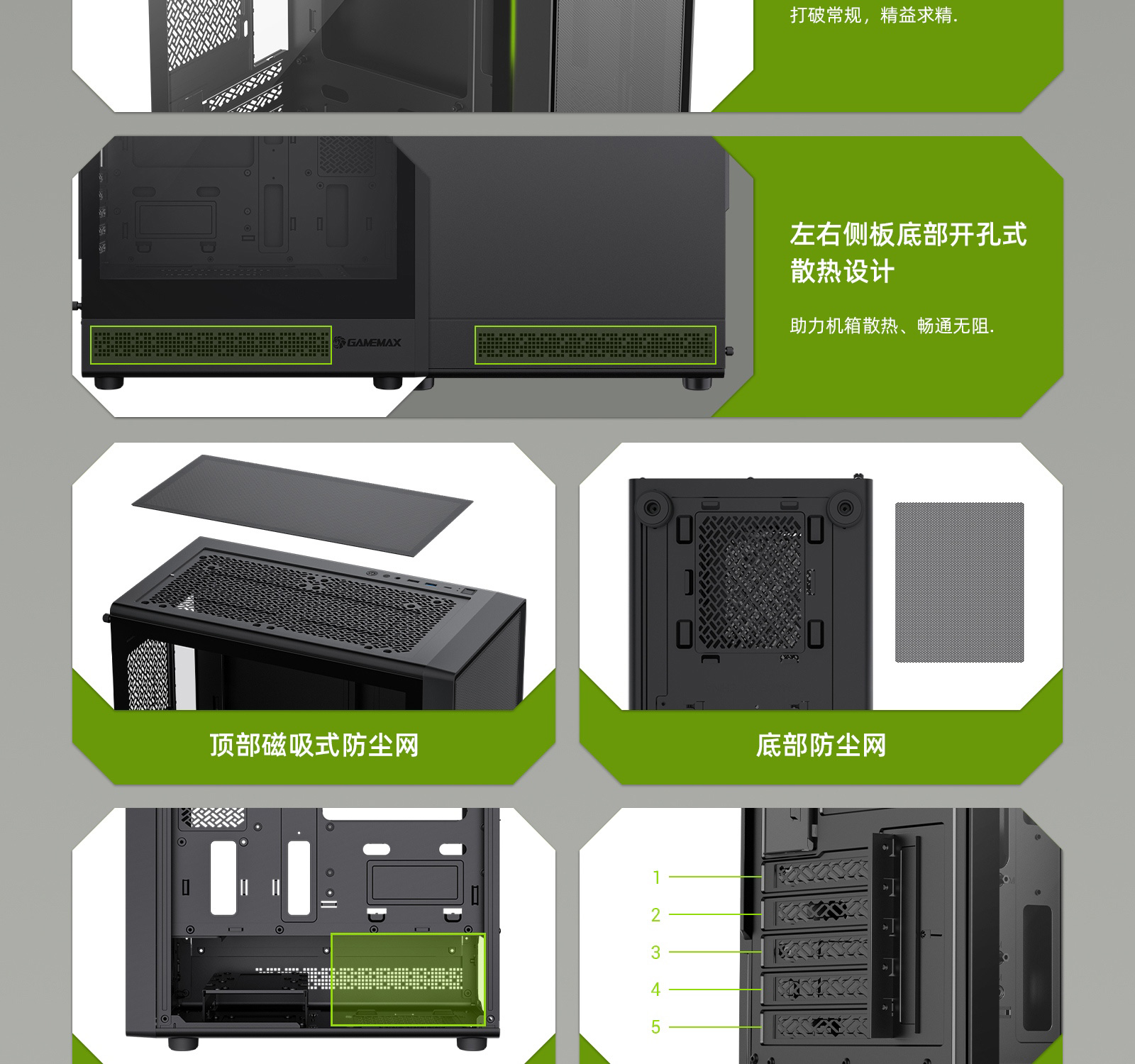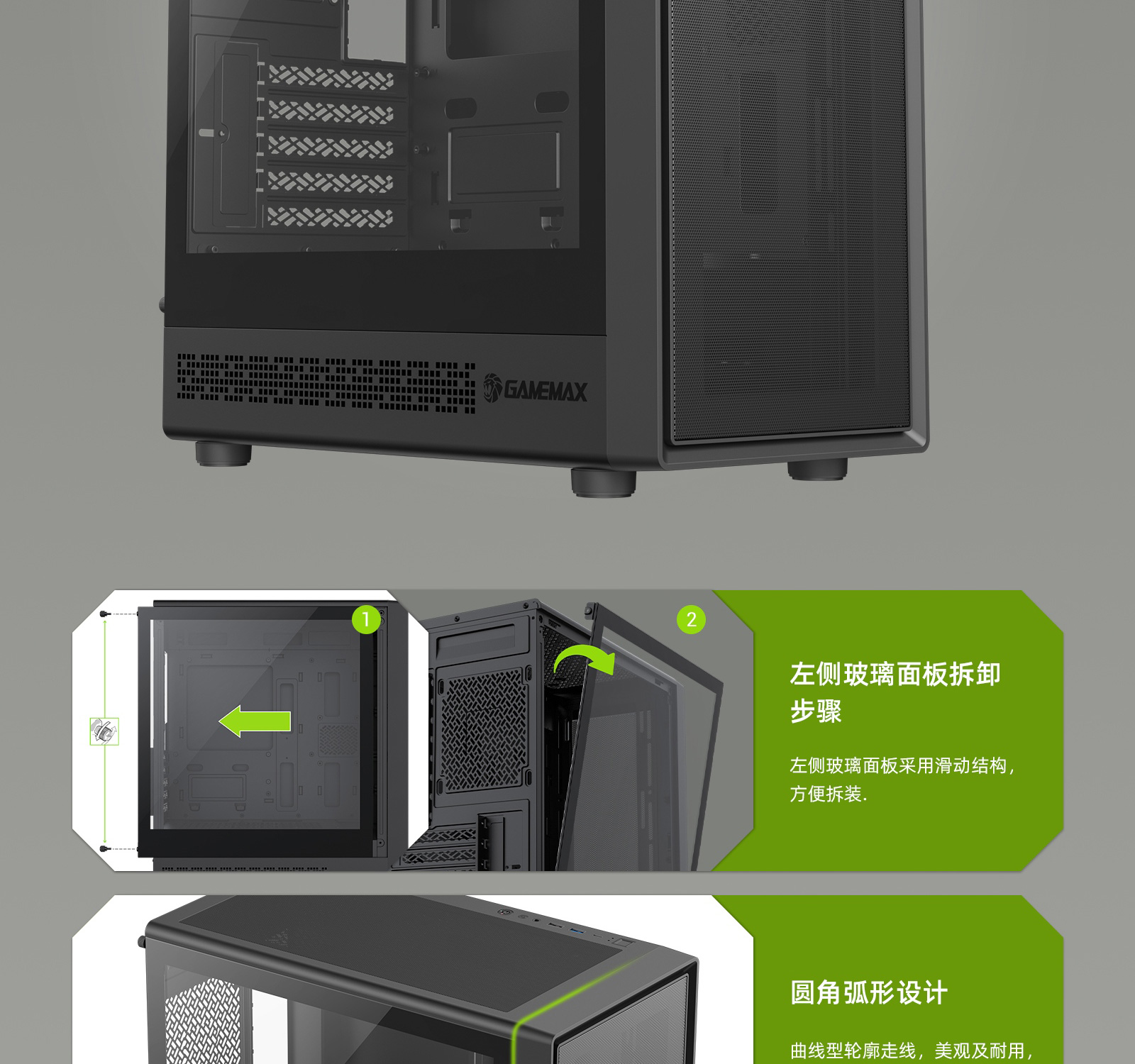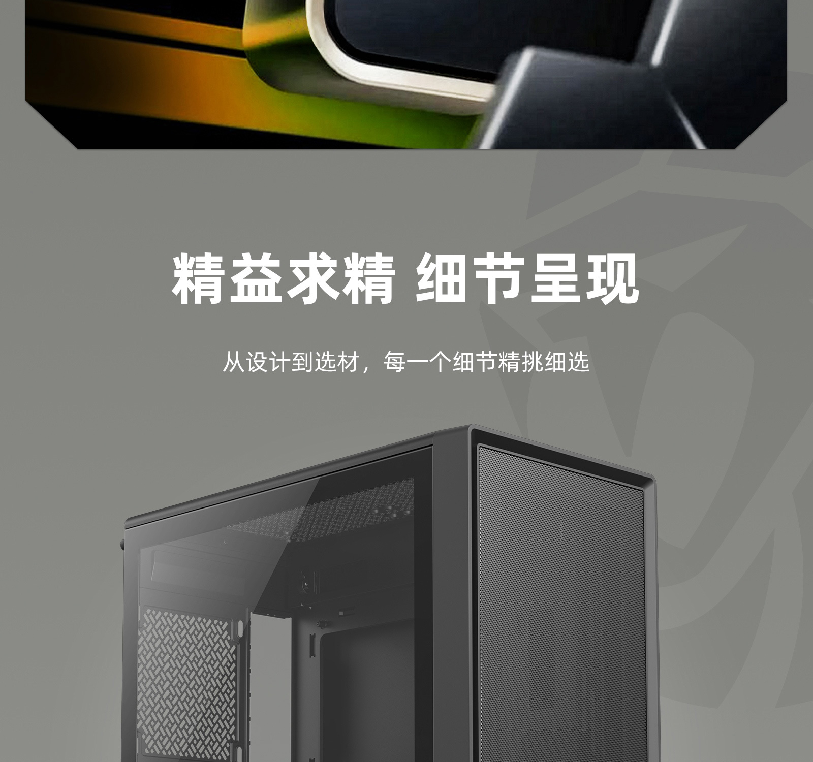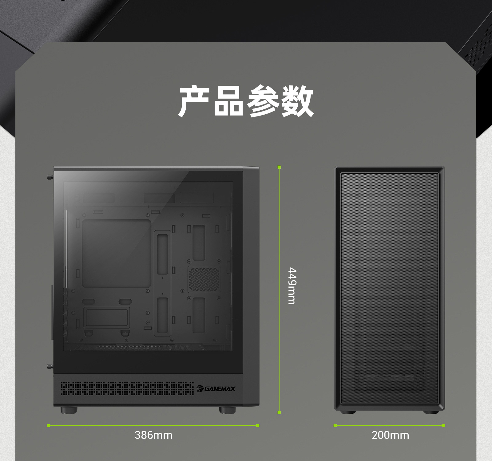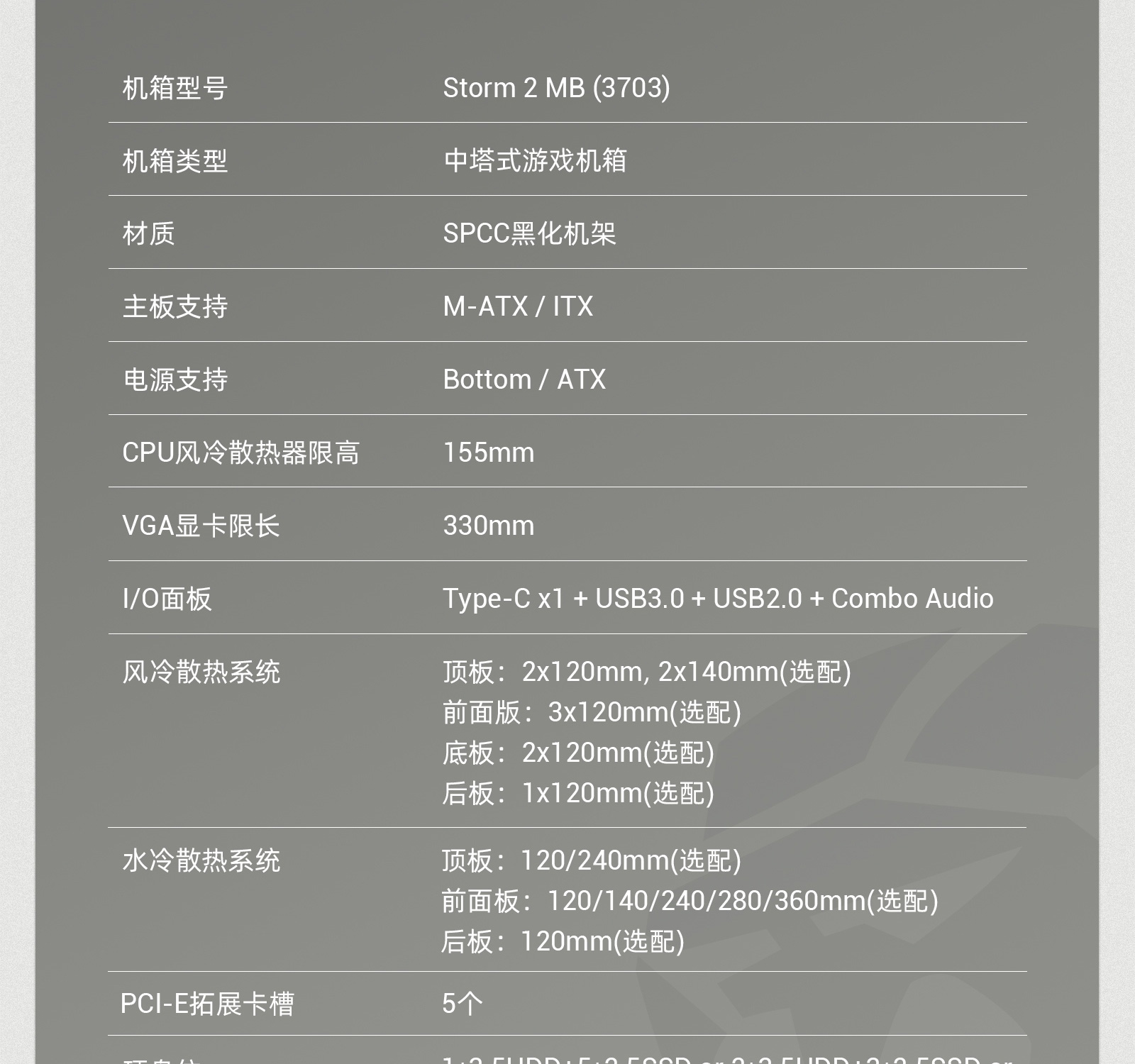 | 风冷散热系统 | 顶板:2x120mm, 2x140mm (选配)前面板:3x120mm (选配)底板:2x120mm (选配)后板:1x120mm (选配) |