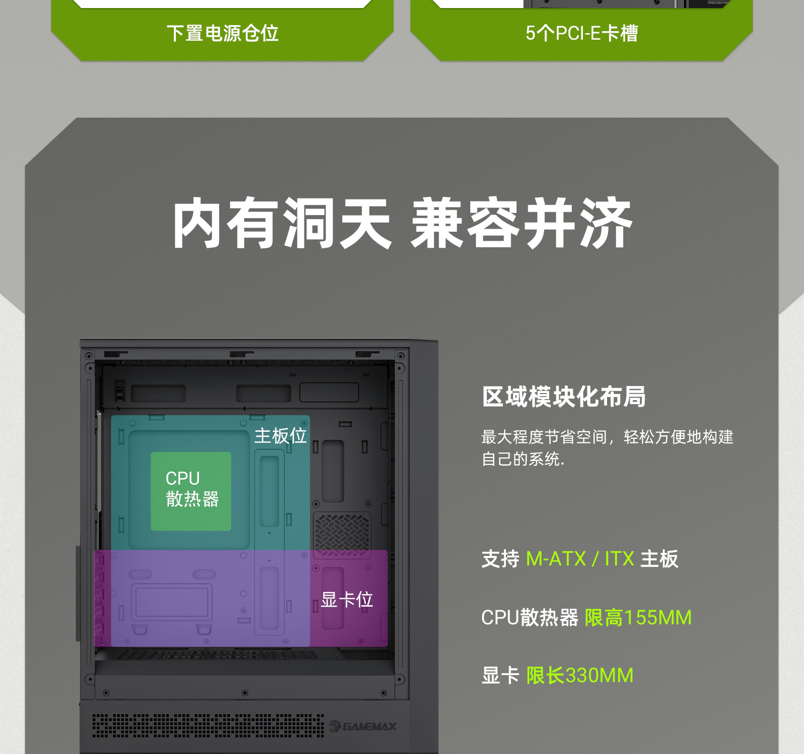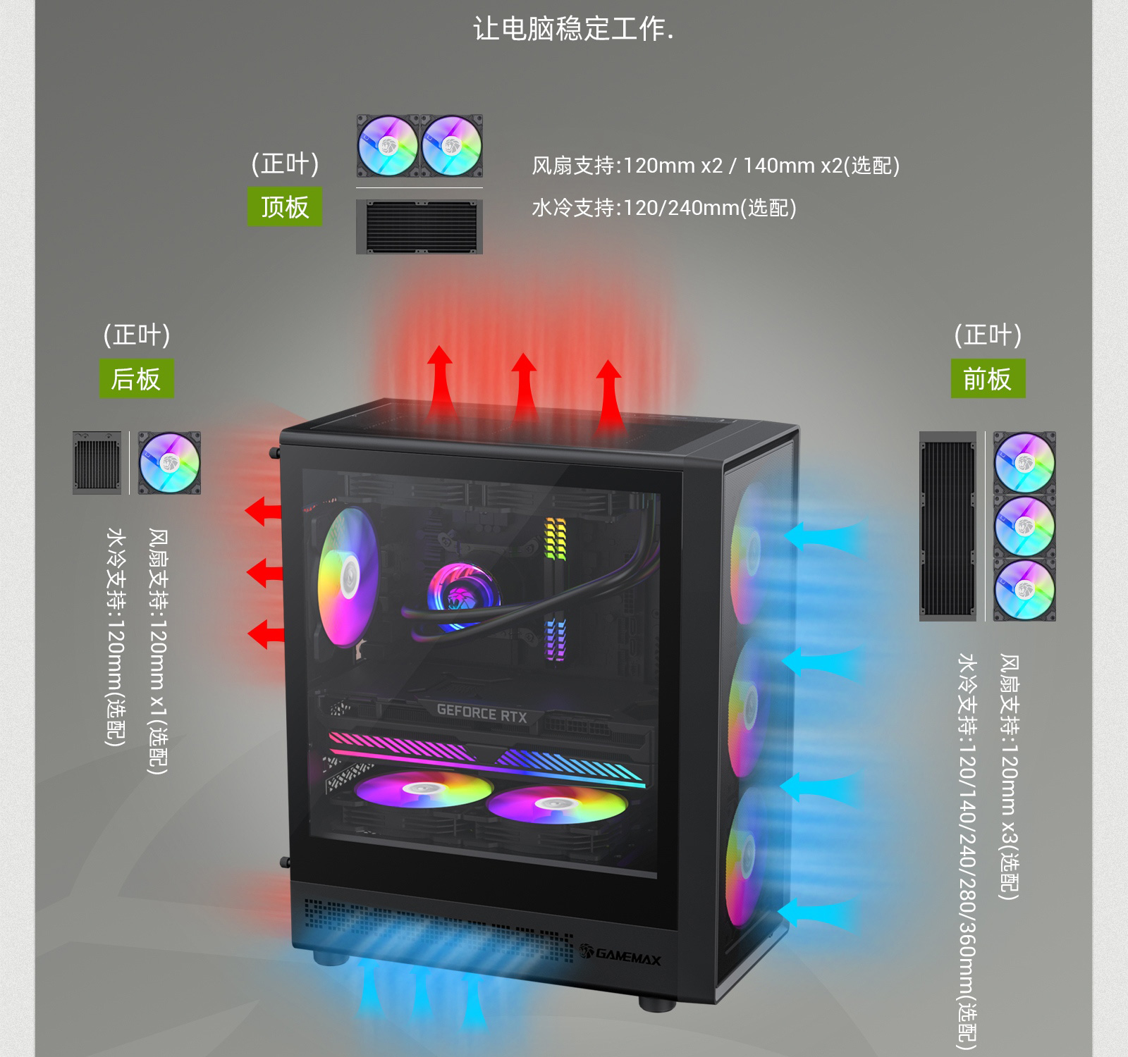 | 水冷散热系统 | 顶板:120/240mm (选配)前面板:120/140/240/280/360mm (选配)后板:120mm (选配) |