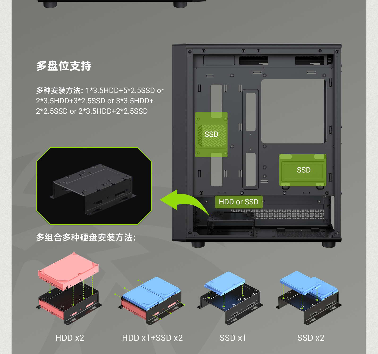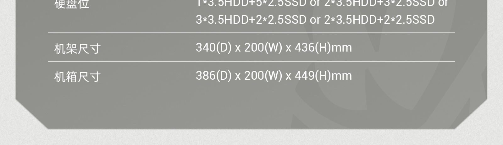 | 硬盘位 | 13.5HDD+52.5SSD or 23.5HDD+32.5SSD or 33.5HDD+22.5SSD or 23.5HDD+22.5SSD |