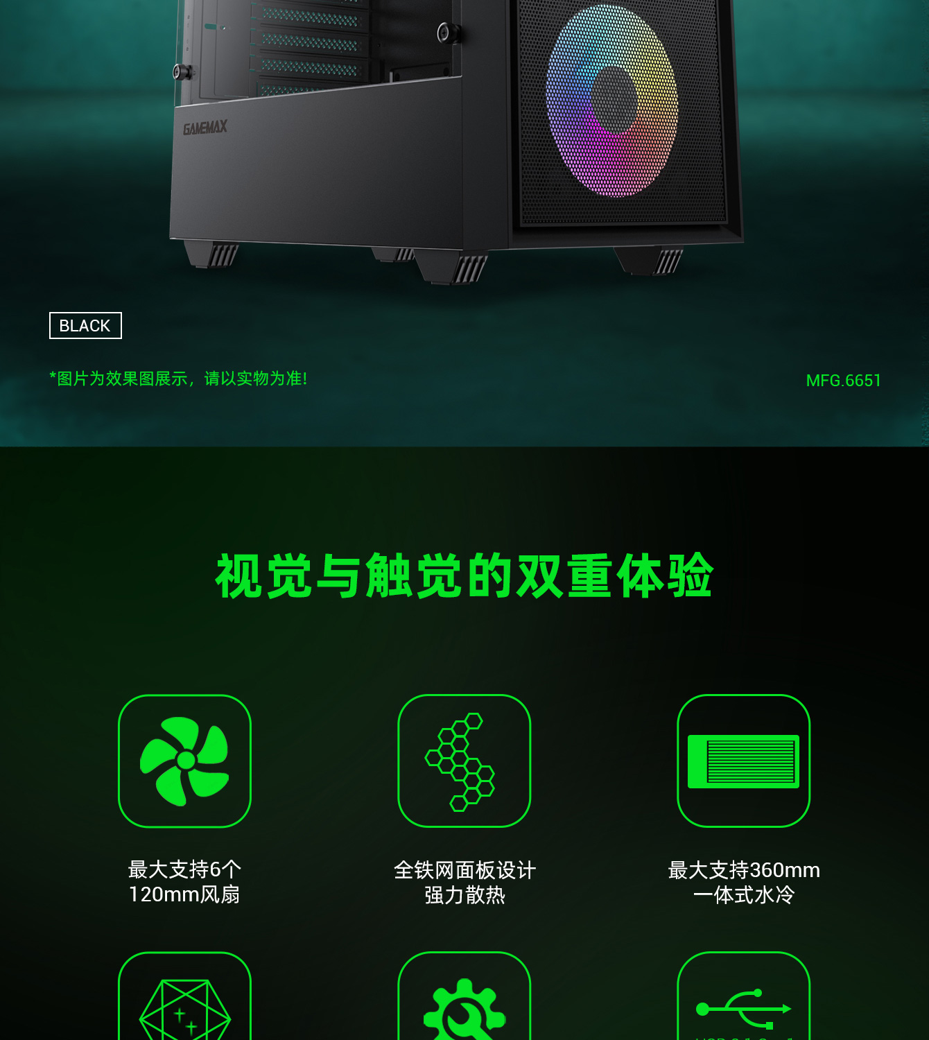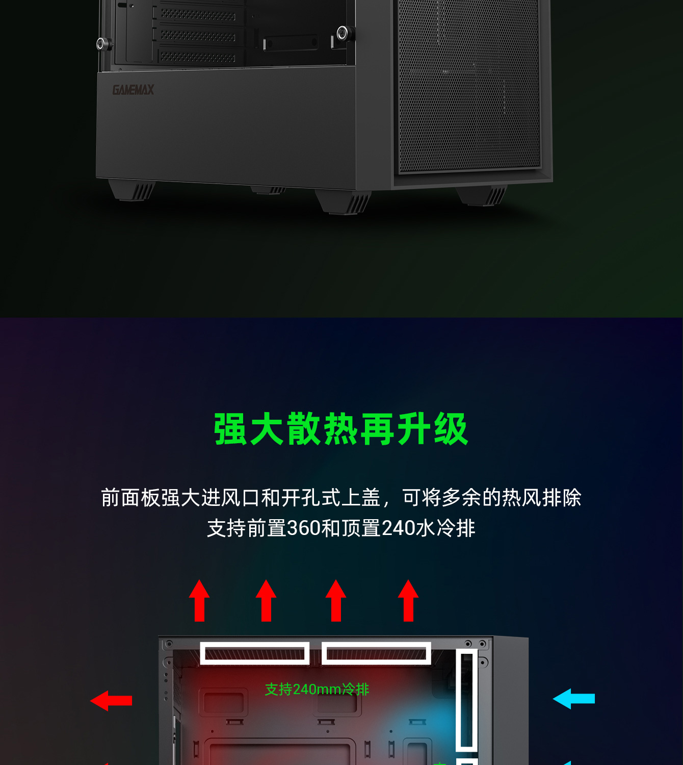 | 水冷支持 | 前置:120/140/240/280/360mm (选配)顶置:120/140/240mm (选配)后置:120mm (选配) |