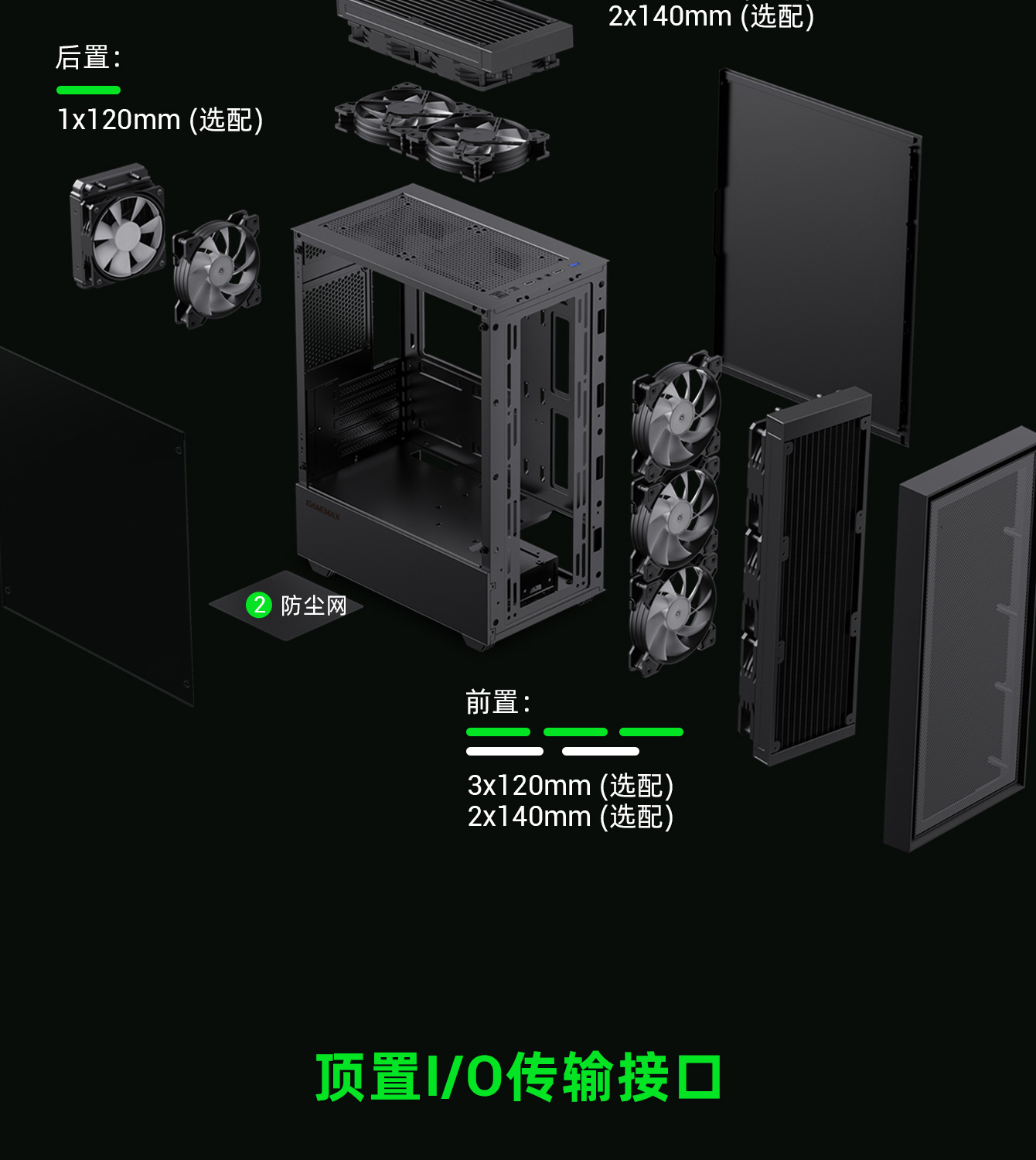 | 风扇支持 | 前置:3x120mm/2x140mm (选配)顶置:2x120mm (选配)后置:1x120mm (选配) |