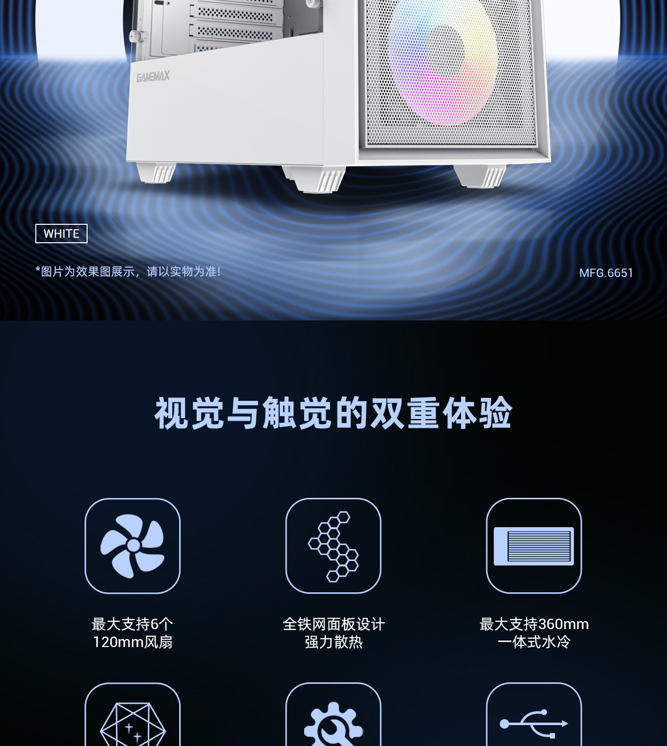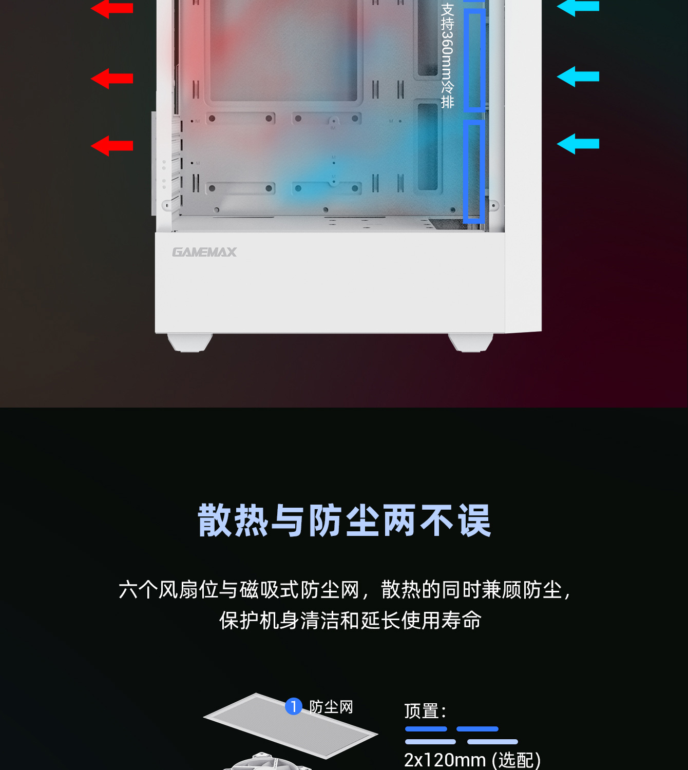 | 风扇支持 | 前置:3x120mm/2x140mm (选配)顶置:2x120mm (选配)后置:1x120mm (选配) |