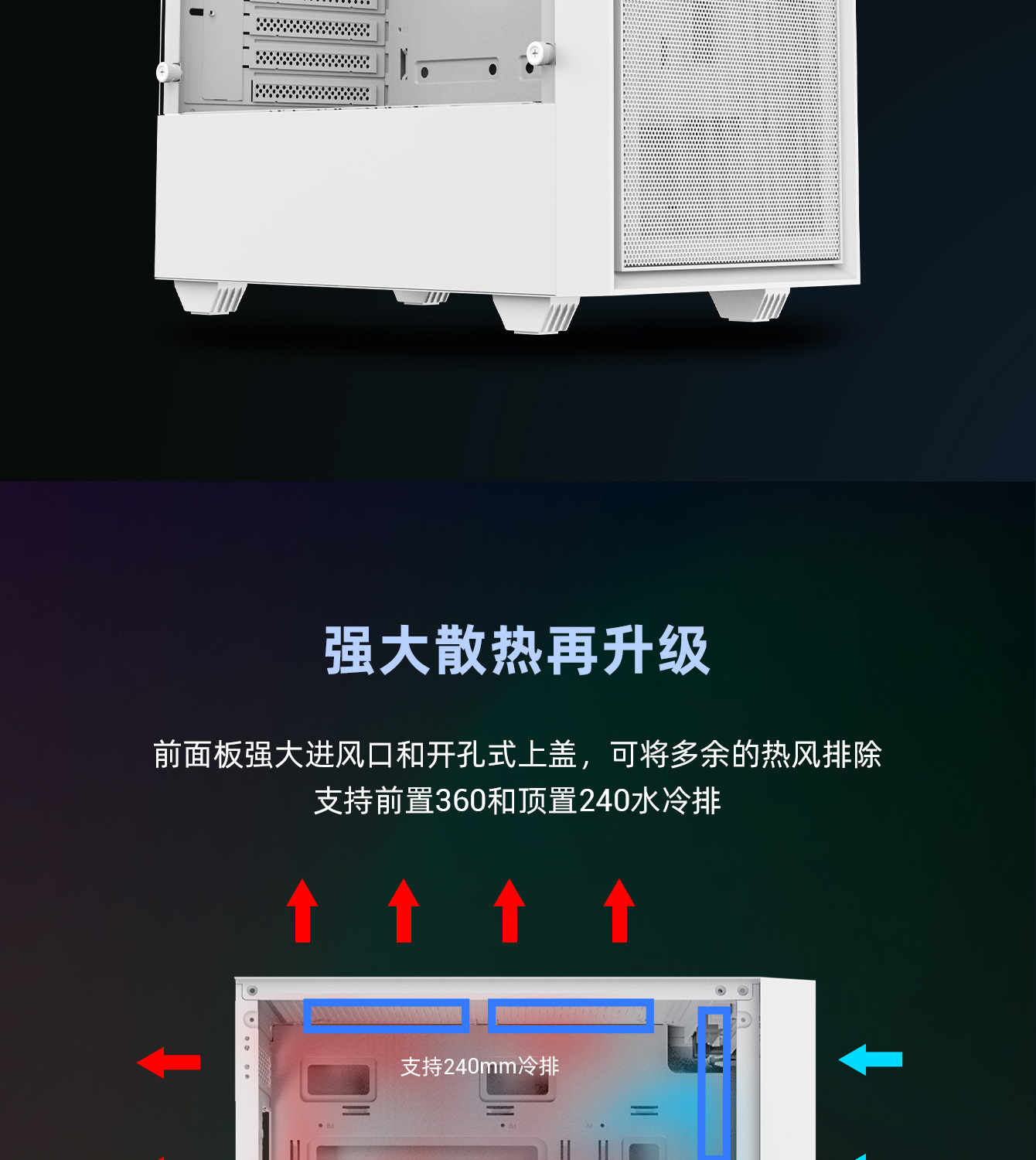 | 水冷支持 | 前置:120/140/240/280/360mm (选配)顶置:120/140/240mm (选配)后置:120mm (选配) |