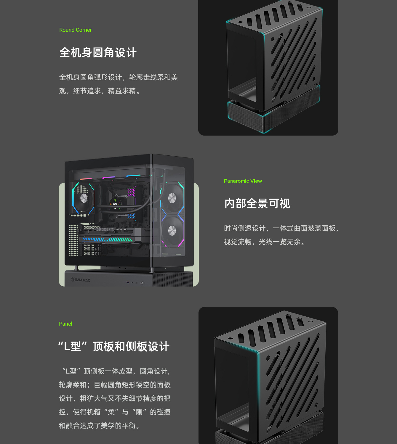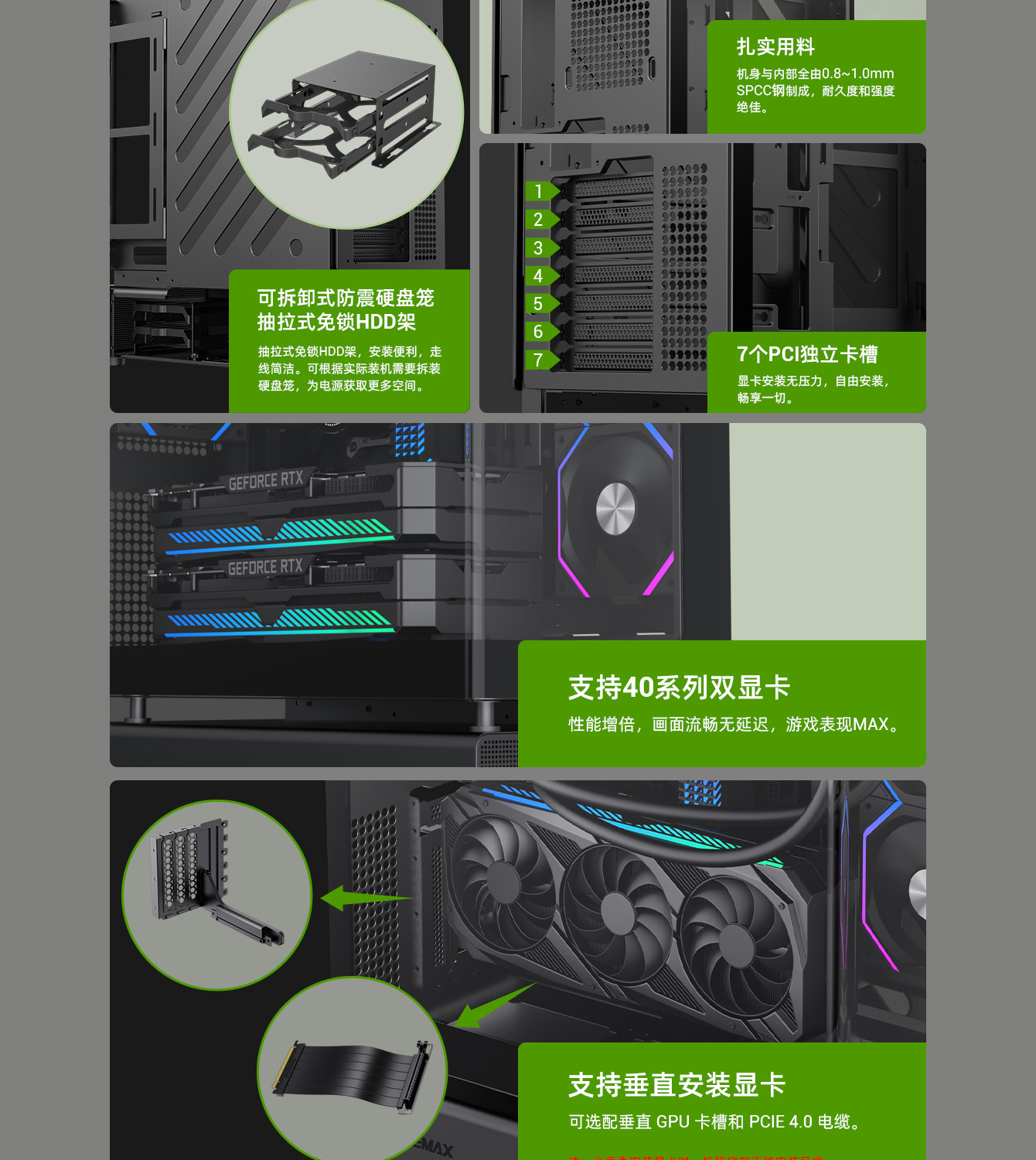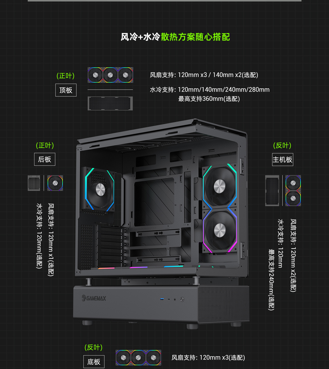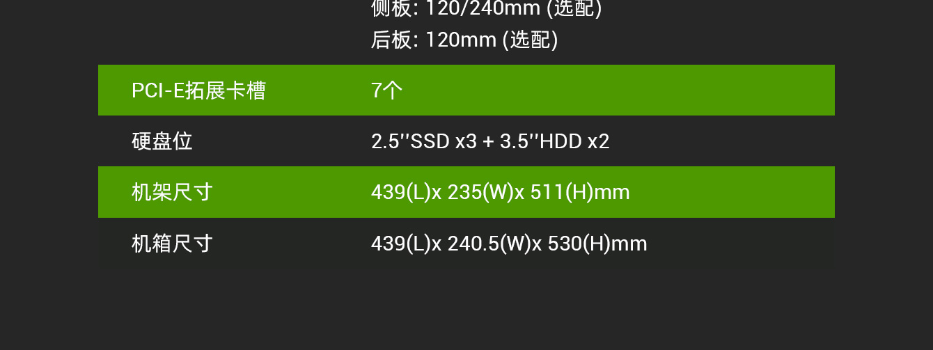 | 水冷散热系统 | 顶板: 120/140/240/280/360mm (选配)侧板: 120/240mm (选配)后板: 120mm (选配) |