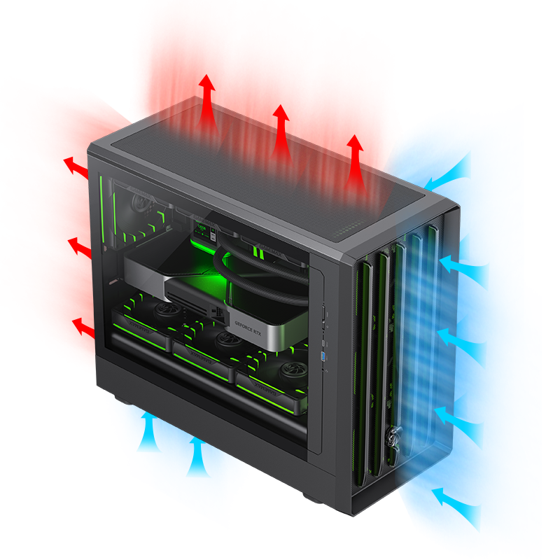 高气流网状前板和垂直气流布局可确保在苛刻的工作负载或游戏过程中高效散热。