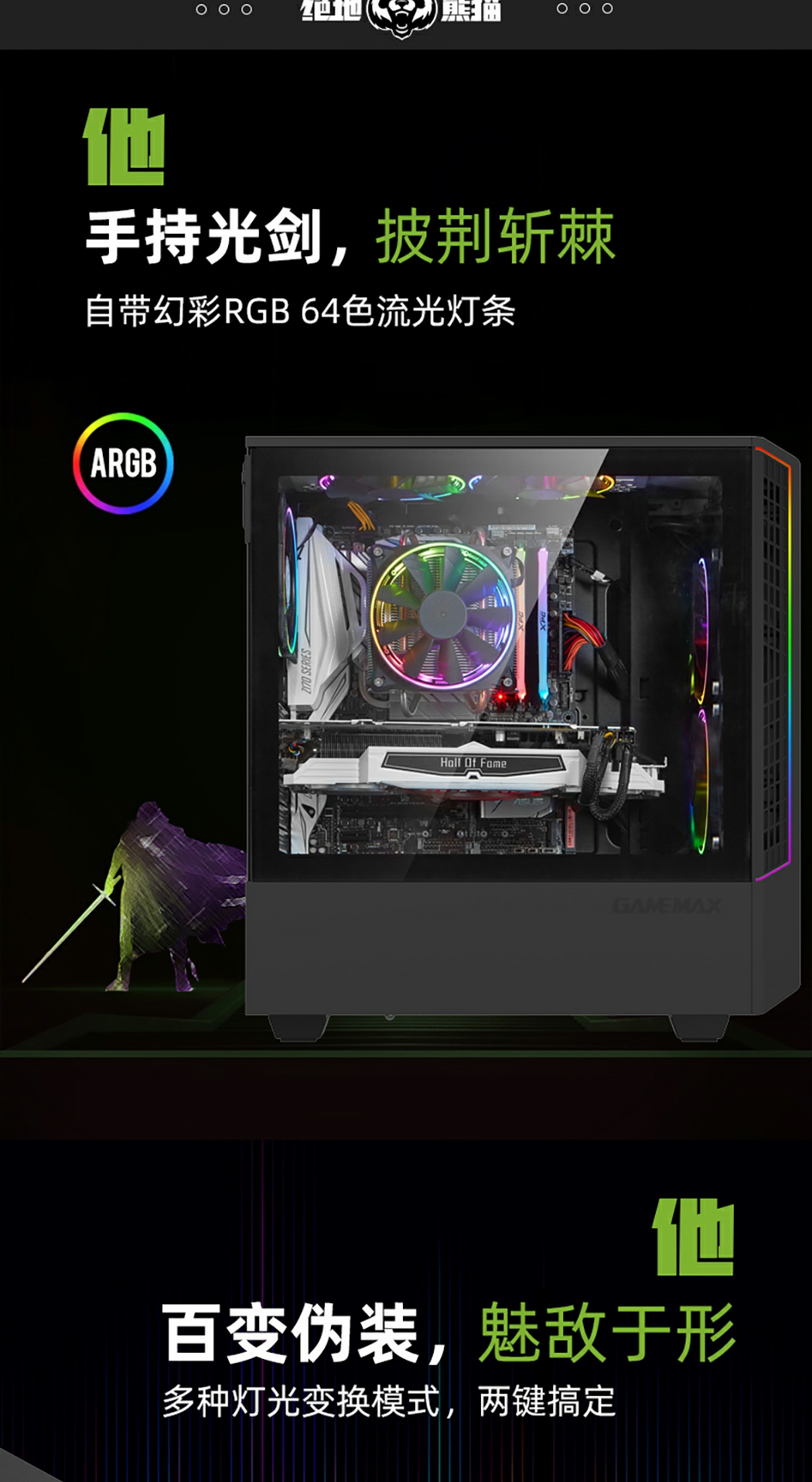 • GameMax绝地熊猫包括 2 个 ARGB LED 灯条和 1 个预装的 ARGB 12 厘米彩虹风扇,以通过内置多过100多种发光模式程式来对灯光模式控制,来构建电脑主机外观的美感。