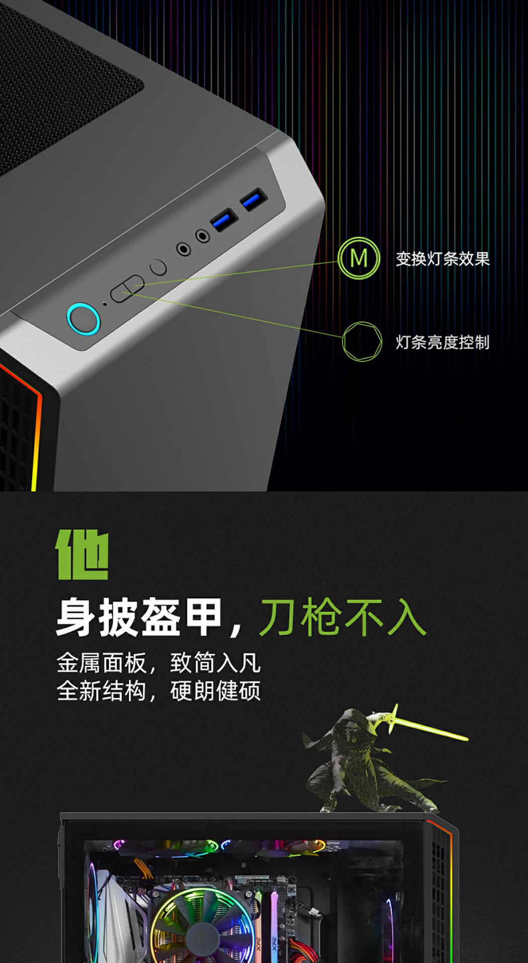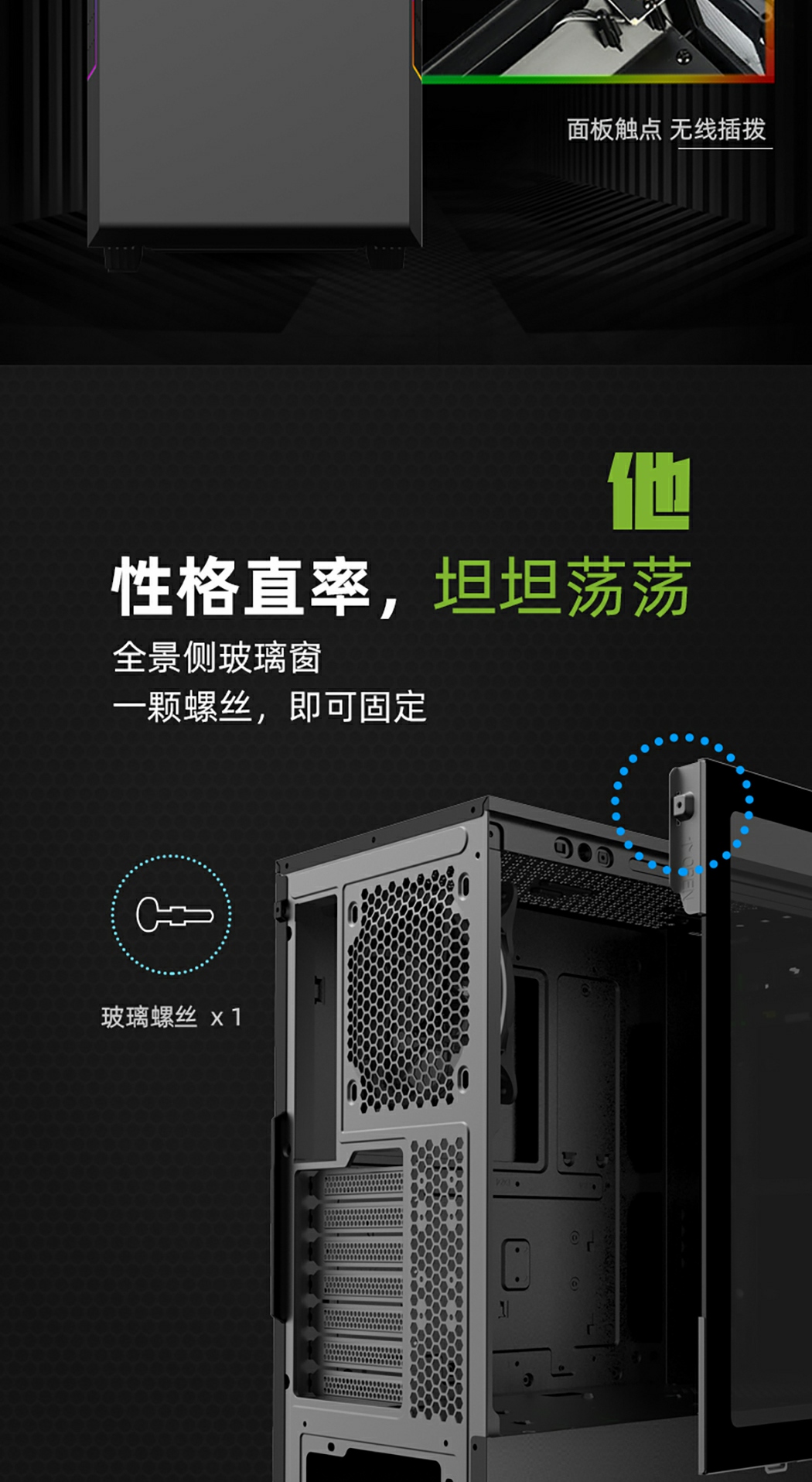 GameMax绝地熊猫Panda紧凑型中塔机箱采用独特的单片螺丝易开玻璃侧窗,以及面板双侧大气的ARGB 灯带。增加电脑主机的神秘感及可玩性 , 您可以通过预装的 GameMax V2.0 PWM+Rainbow HUB 控制器轻松控制 ARGB 灯光和风扇转速来自适应降噪通过 PWM 控制进行优化。