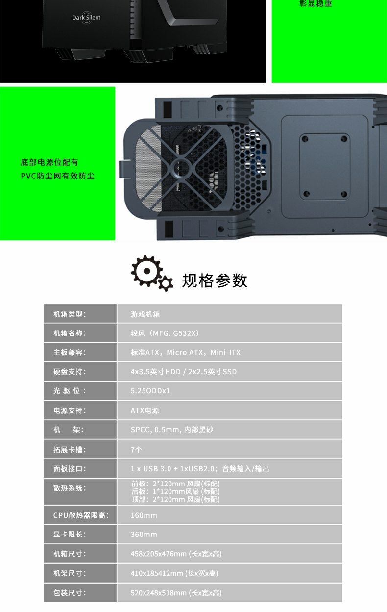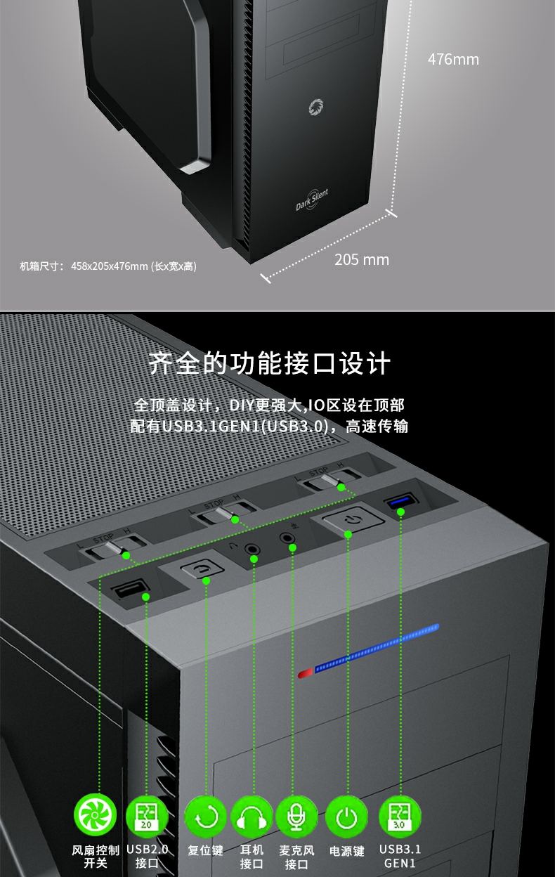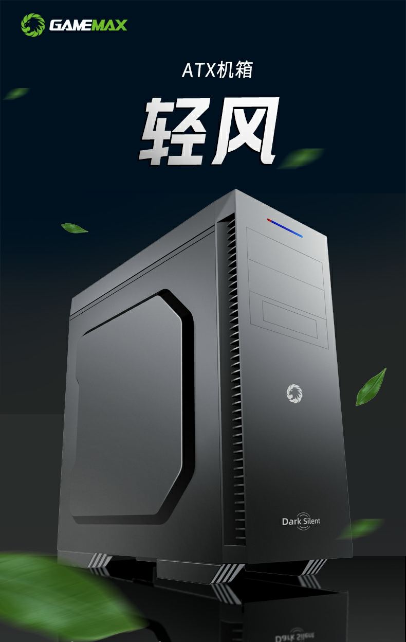 GameMax小轻风Dark Silent 静音设计和防尘,两侧面板内有左右静音棉),顶部带有防尘罩的隔音罩。 专为高密度降噪的静音计算而设计。