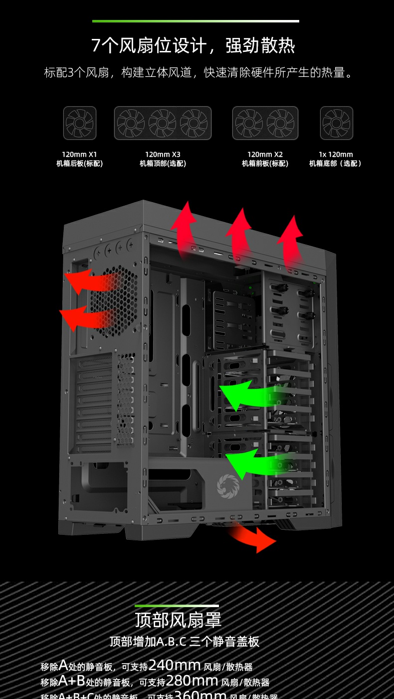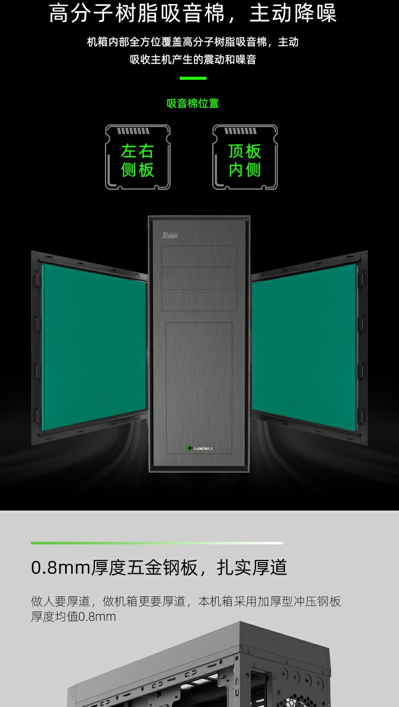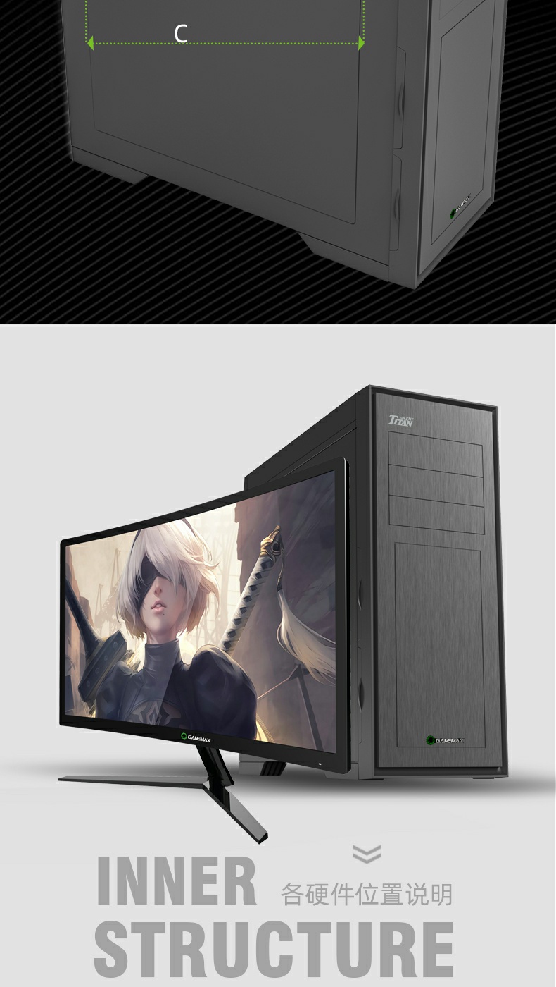 • Gamemax巨人静音机箱支持长达 430mm 显示卡和 165mm 高度的 CPU 散热器。及360机置360水排装置,总之强大的扩展性,保障你随时升级的需求!