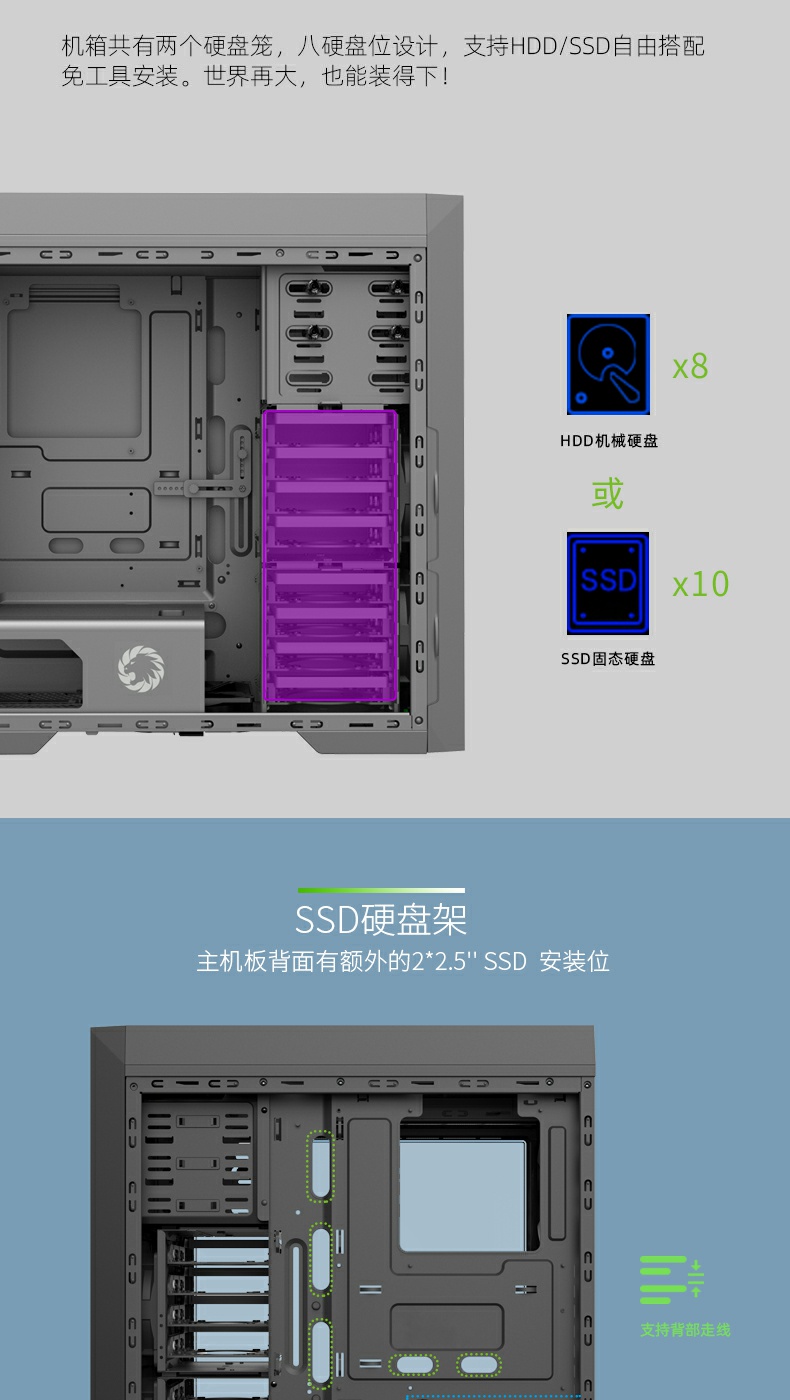 • 五金结构用全滚边工艺,无毛刺,确保组装中安全快速,机箱配备总共 8+2 组免工具 HDD架易于组装并可装多达10个HDD/SSD,主板背面额外增加 2 个 SSD。