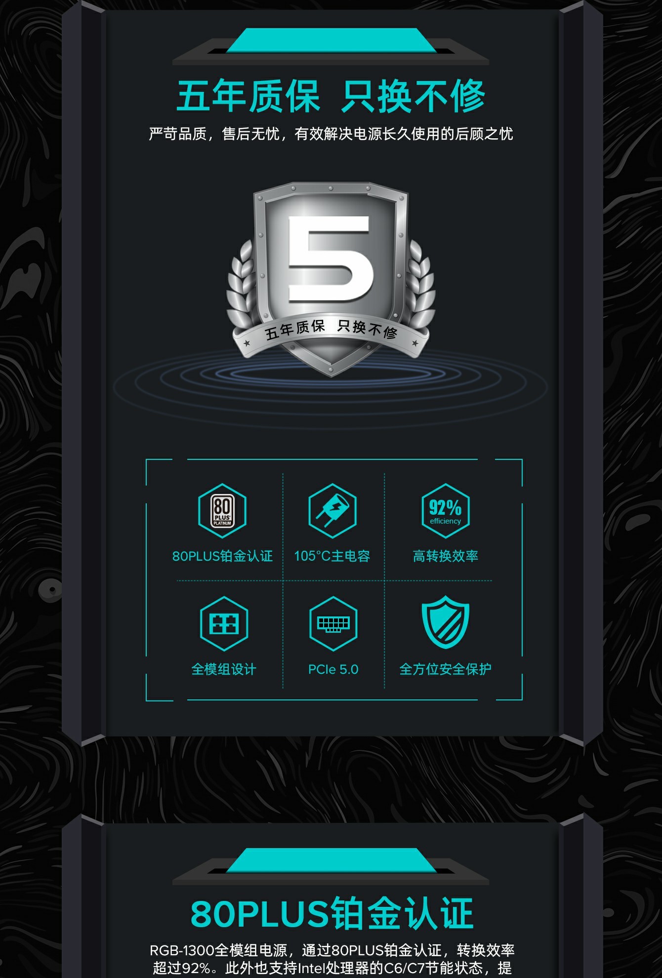 80 Plus 铂金认证:RGB-1050 PRO 在典型负载下具有 92% 或更高的效率。更低的功耗、更低的噪音和更低的温度。
