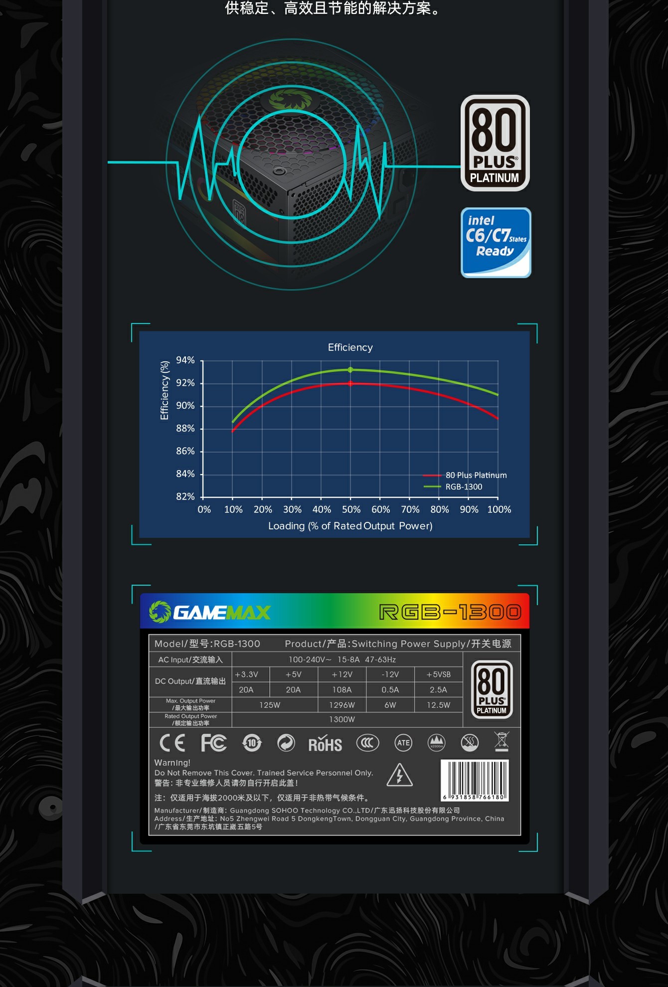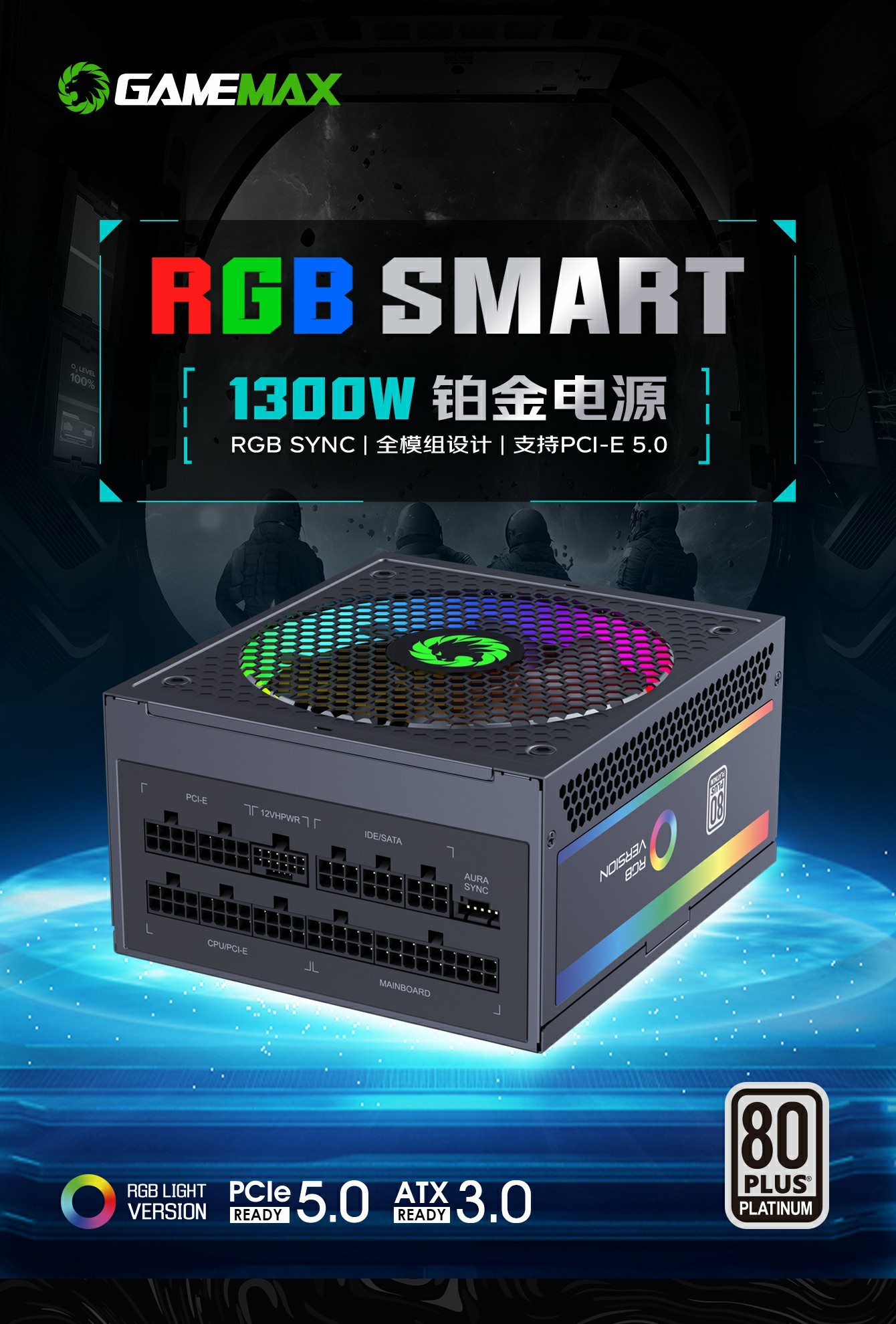 GameMax RGB-1300 ATX3.0版本支持PCIe5.0, 铂金模组电源,全模块化 LLC+DC-DC 设计,强大的单路 +12V 输出设计有助于确保稳定,并可靠地为其他 PC 组件供电。配备 140 毫米 ARGB 风扇有助于提供更明亮和令人惊叹的灯光效果,支持与华硕、技嘉、微星和华擎兼容的 RGB 主板同步,提供无数照明可能性。