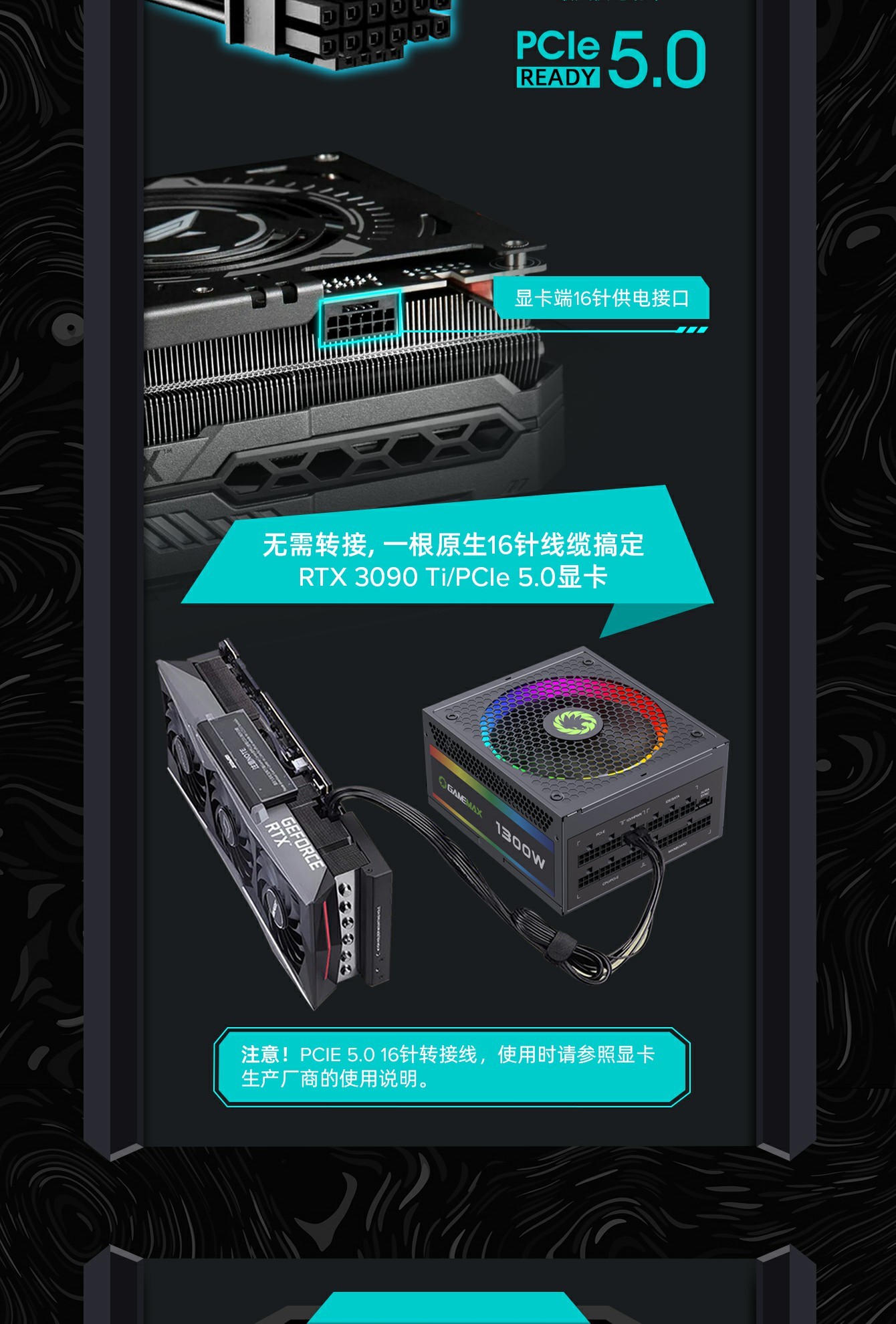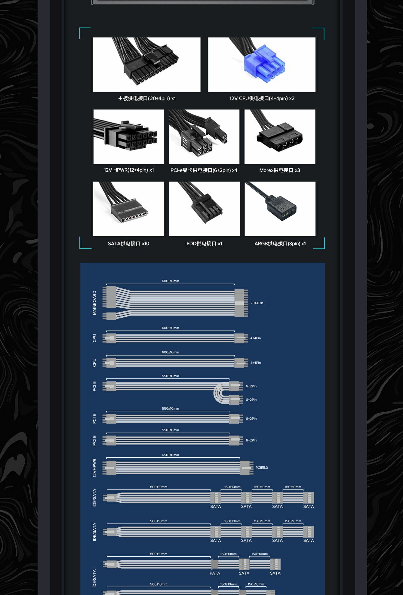 ATX3.0版本:带1x16PIN原生PCI-E5.0接口及配套线材,更快速方便满足最新的显示卡,并使显示器性能输出更稳定,提供全方面电源电压需求保障