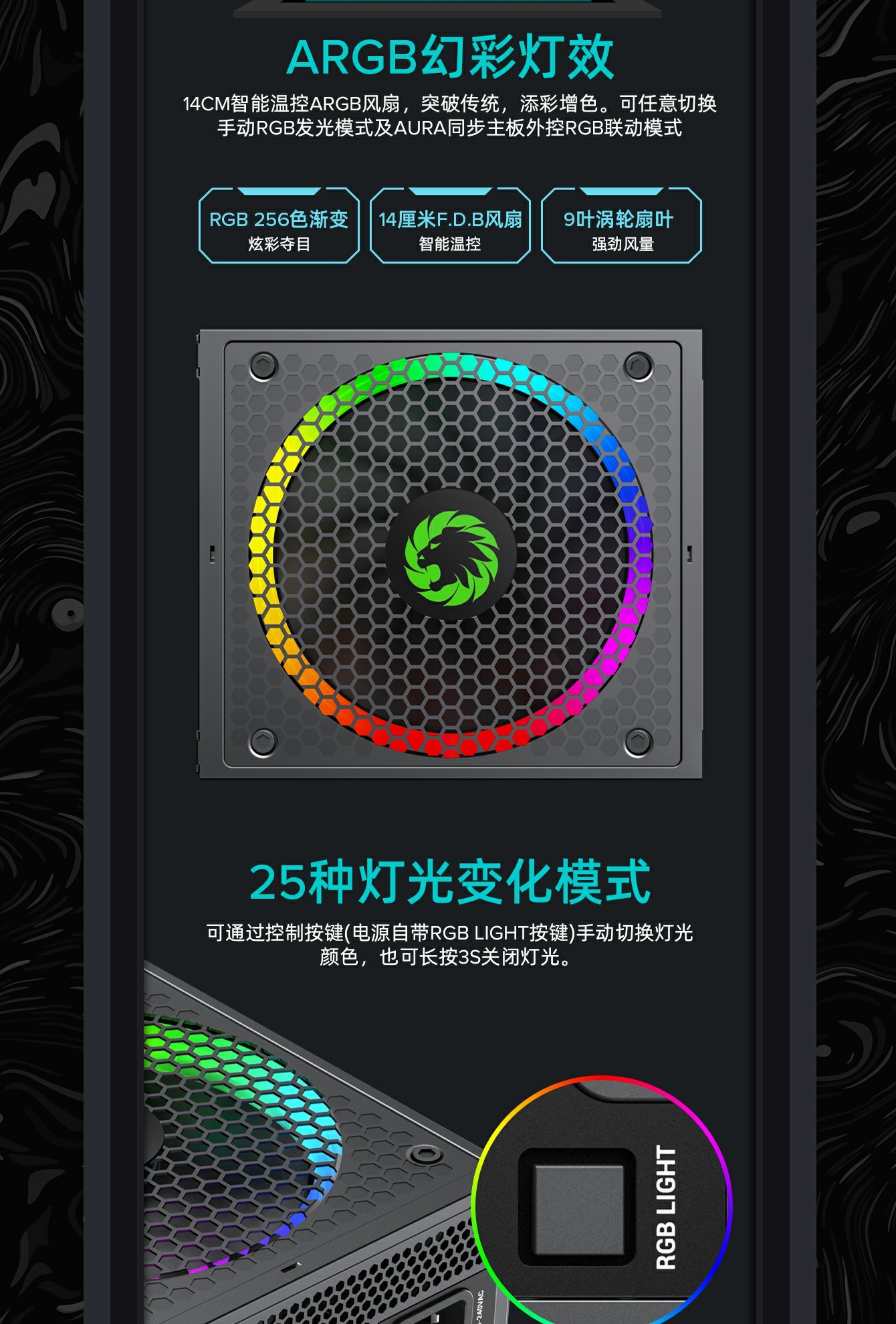RGB灯模式:25种带记忆功能的智能RGB灯模式,按下RGB控制器开关选择你喜欢的颜色模式单色模式、呼吸灯模式、混色模式。
