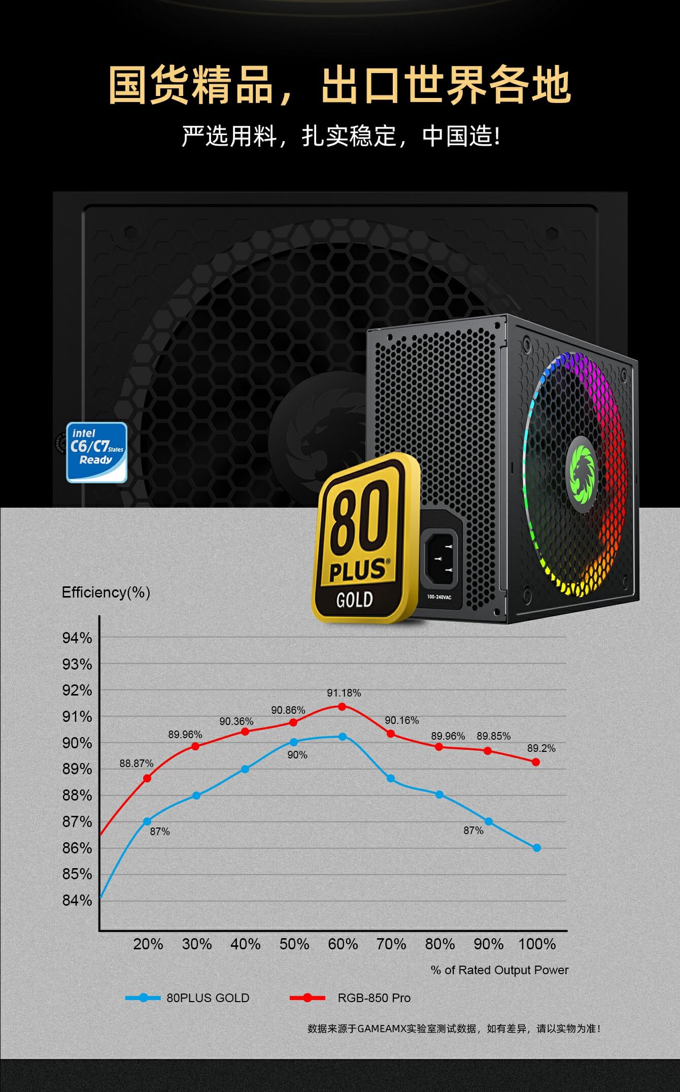 80 Plus 金牌认证:RGB-1050 PRO 在典型负载下具有 90% 或更高的效率。更低的功耗、更低的噪音和更低的温度。